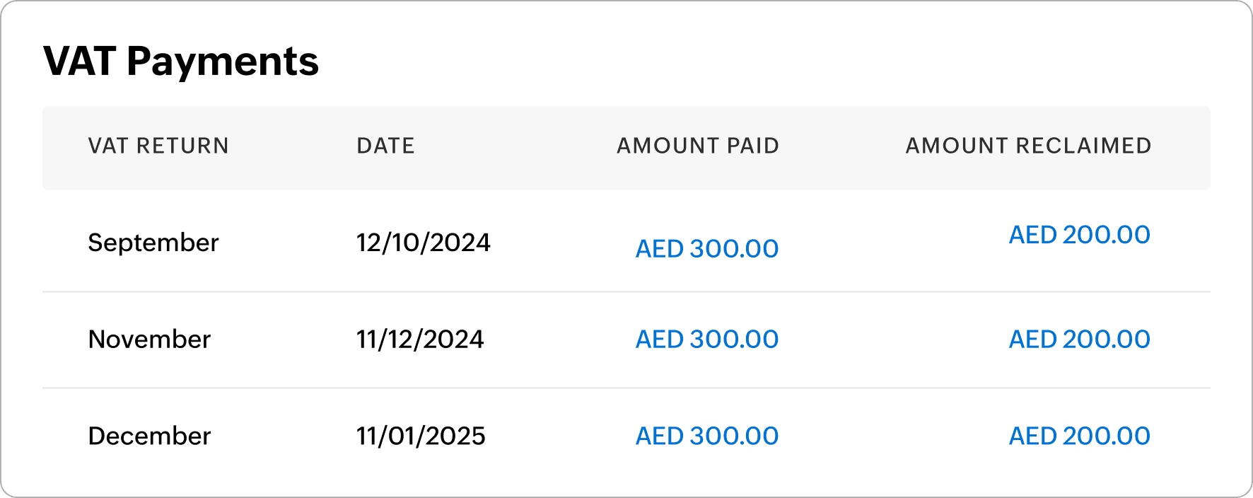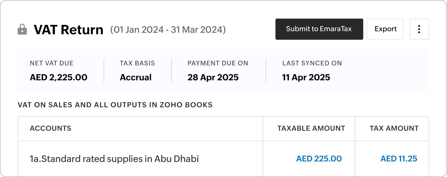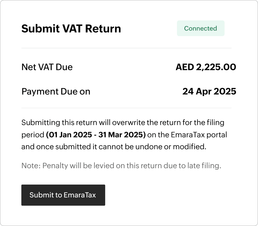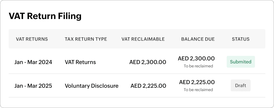 Zoho Books is recognised as a Digital Tax Integrator by the Federal Tax Authority. Your favourite VAT-compliant accounting software, now lets you directly file VAT returns with the EmaraTax portal. No more manual recording, no more errors, and no more late submissions!