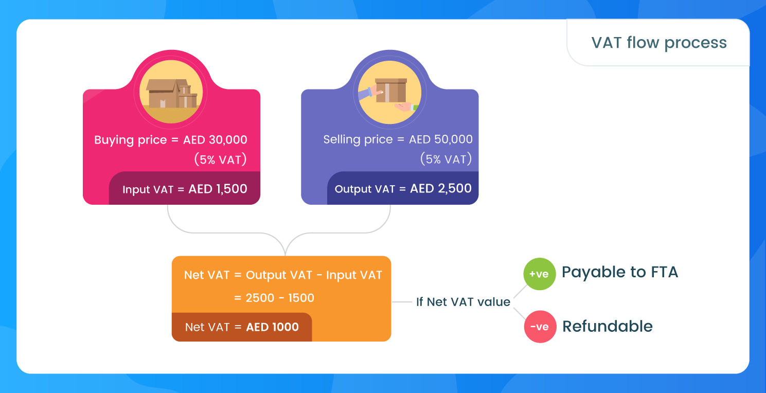 The net VAT of the business is calculated by deducting input VAT from output VAT. If the value of the net VAT is positive, then the business owner owes VAT to the Federal Tax Authority. If the value is negative, the business owner can apply for a claim for the setback amount.