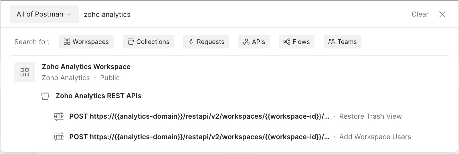 - In the top search bar, type Zoho Analytics Workspace and select Zoho Analytics Rest APIs collection.
