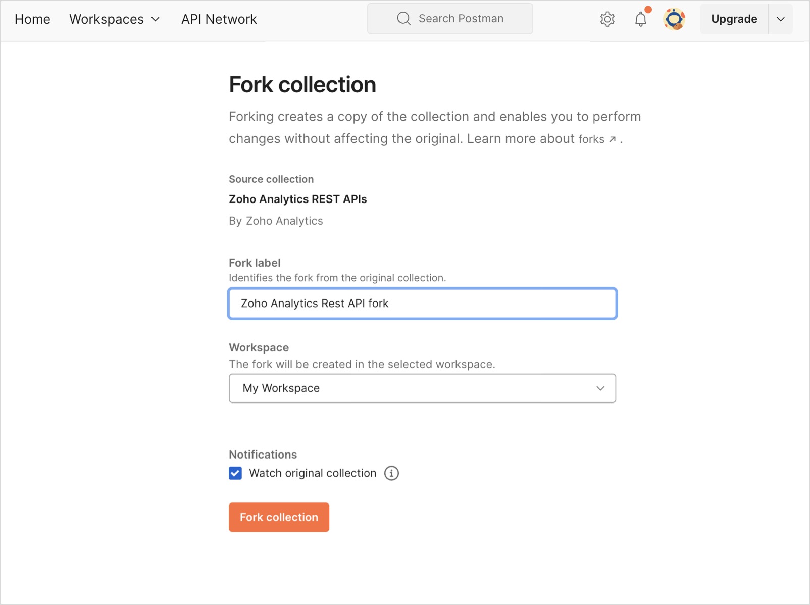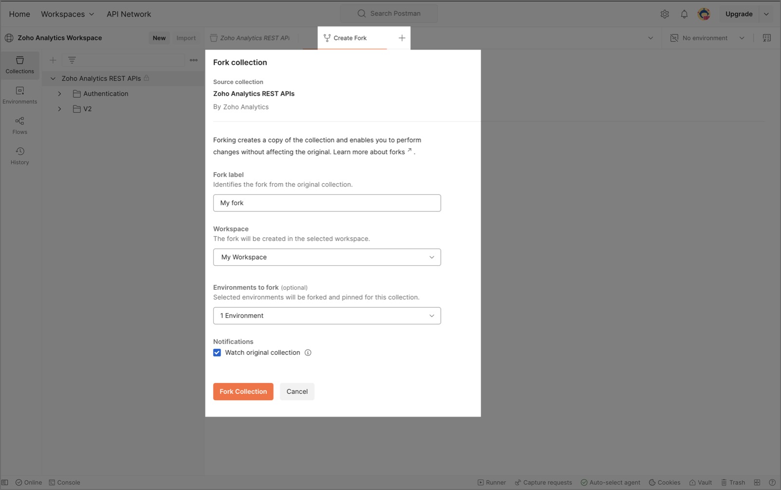 - Provide a name for your fork, choose a workspace, and click Fork Collection to add it.