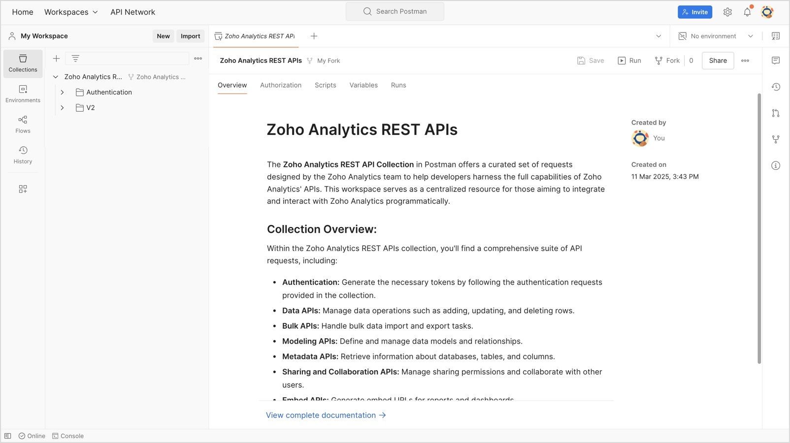 Setting up API environments, defining variables, and managing authorization manually each time you test an API can be challenging. The Zoho Analytics API Postman collection streamlines this process, reducing setup time and minimizing errors.