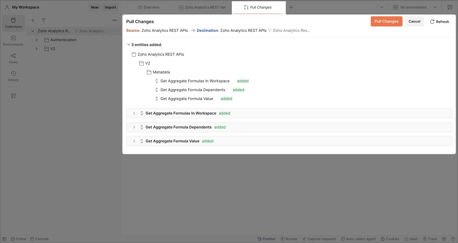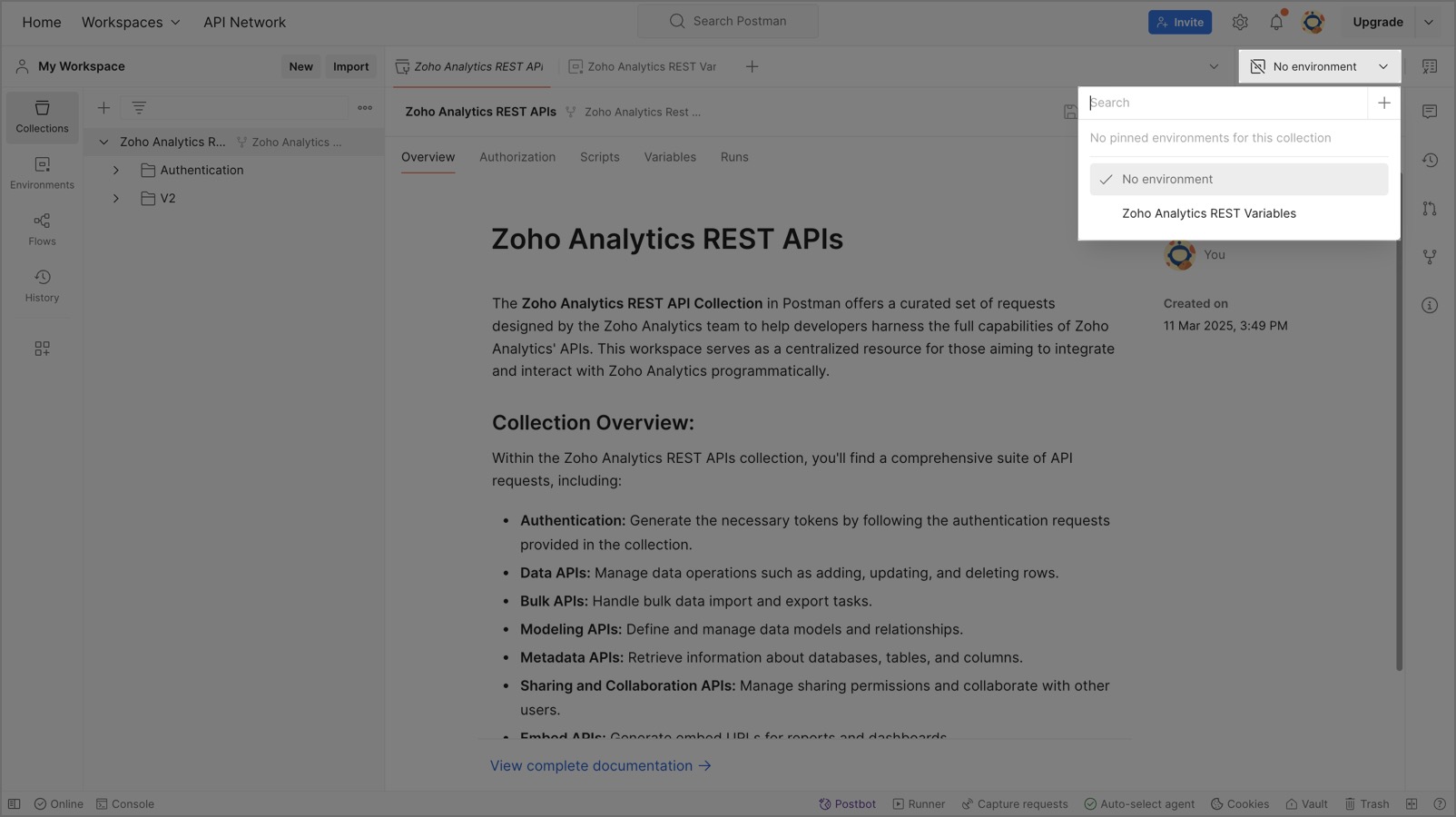 The Zoho Analytics REST API Postman collection is a curated set of API requests designed to simplify testing and exploring Zoho Analytics APIs across various environments. These pre-configured requests allow seamless interaction with the APIs, making the process efficient and user-friendly. Click here to access the Zoho Analytics REST API Postman Collection.