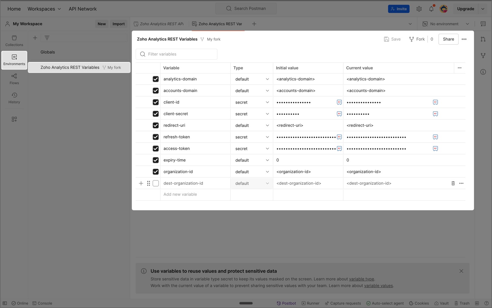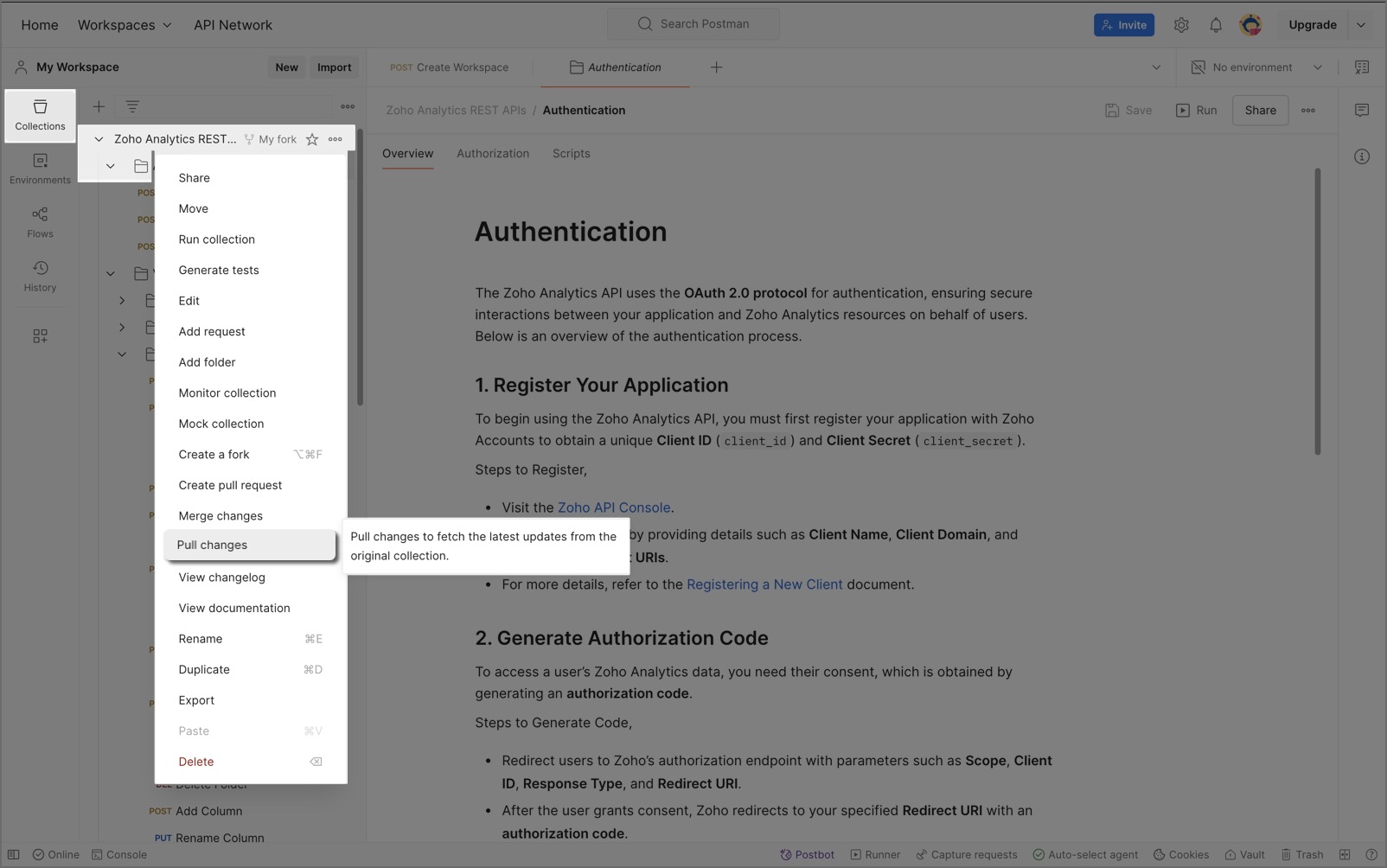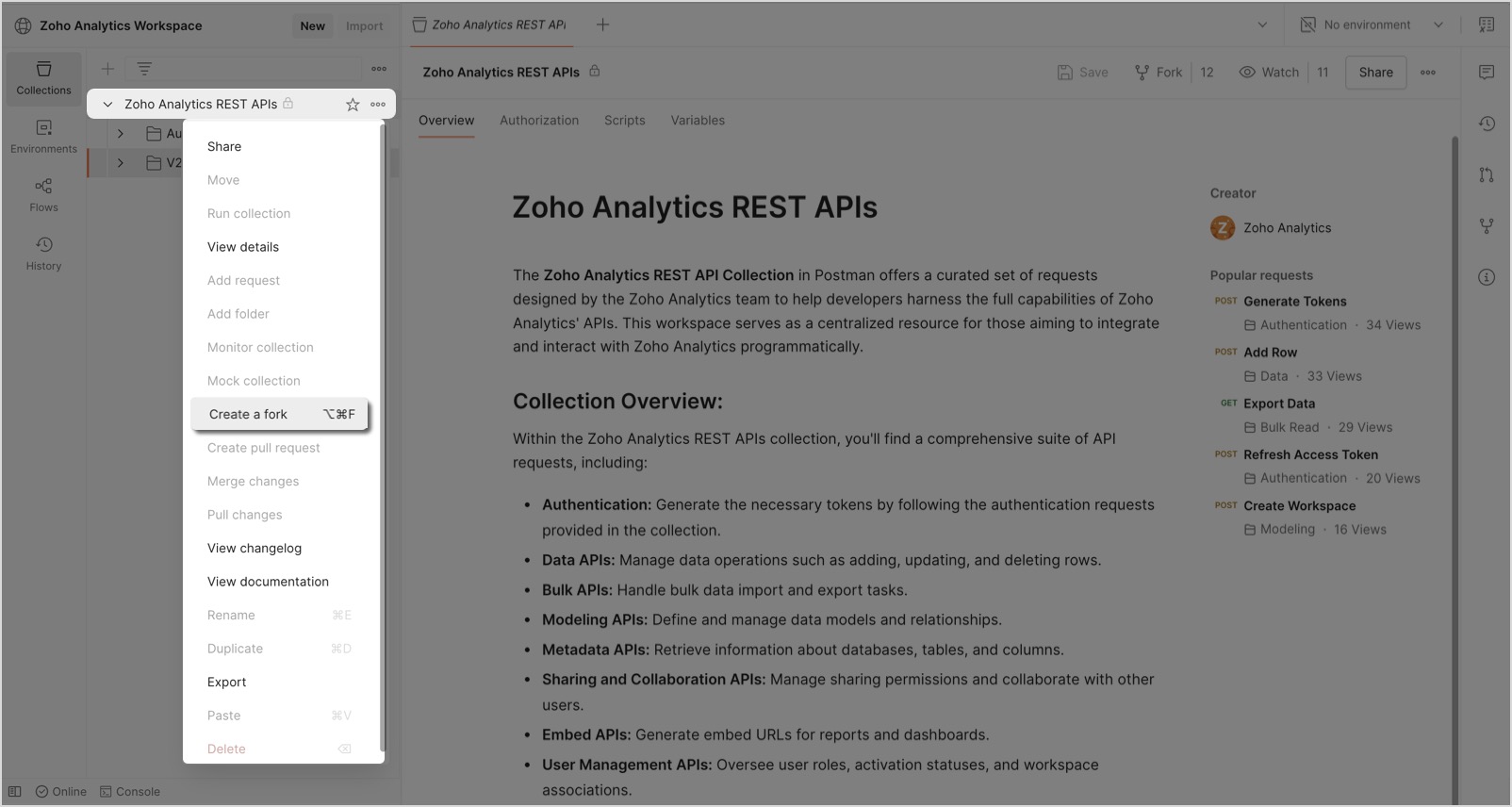 Follow these steps to fork and use the Zoho Analytics REST API Collection: