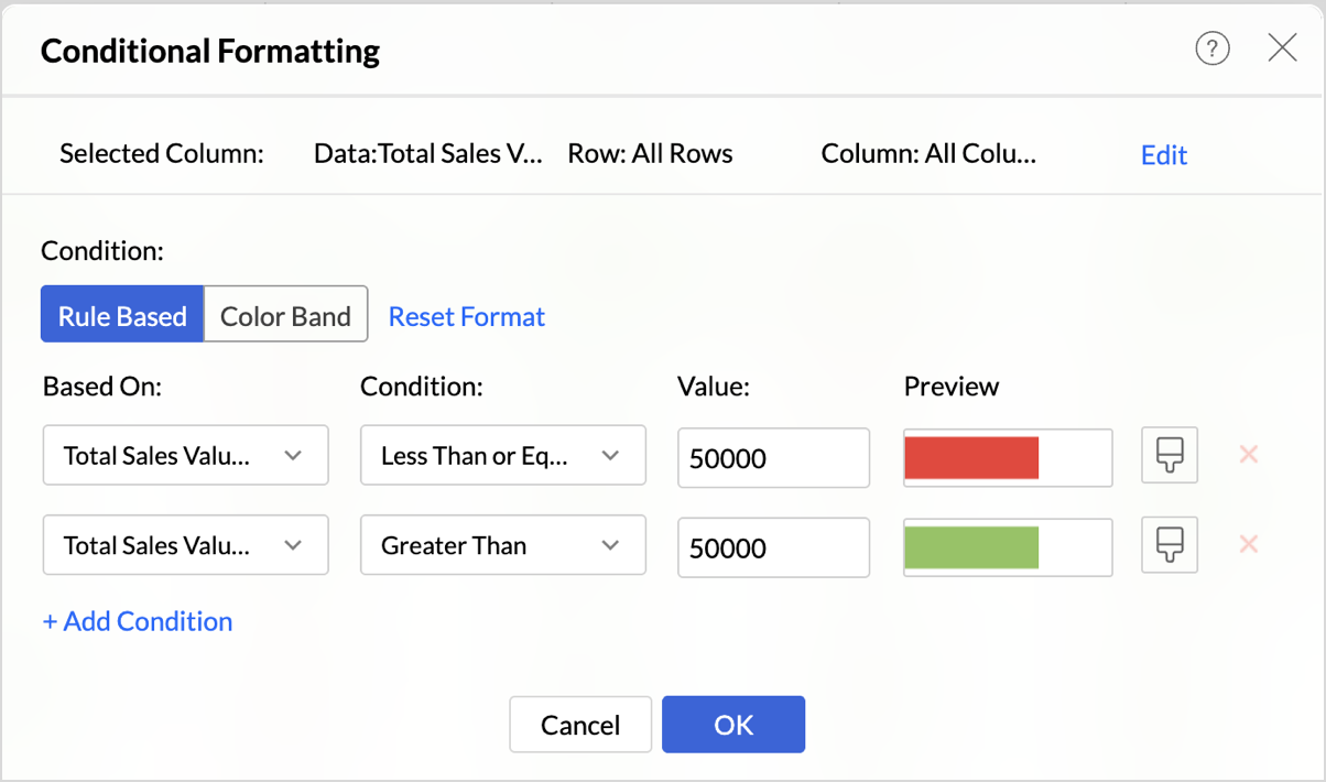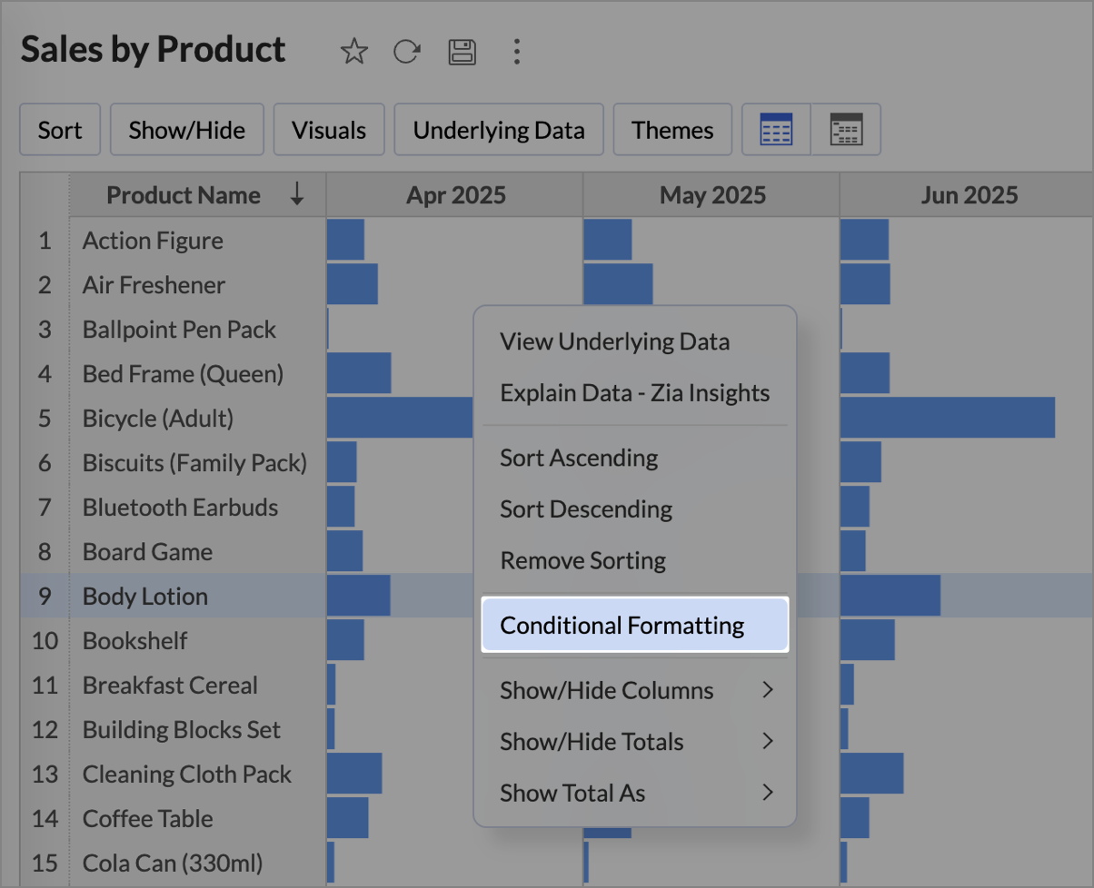 Zoho Analytics allows you to apply conditional formatting directly on Data Bars. This lets you highlight bars that meet specific conditions, making it easier to track outliers or key thresholds at a glance.