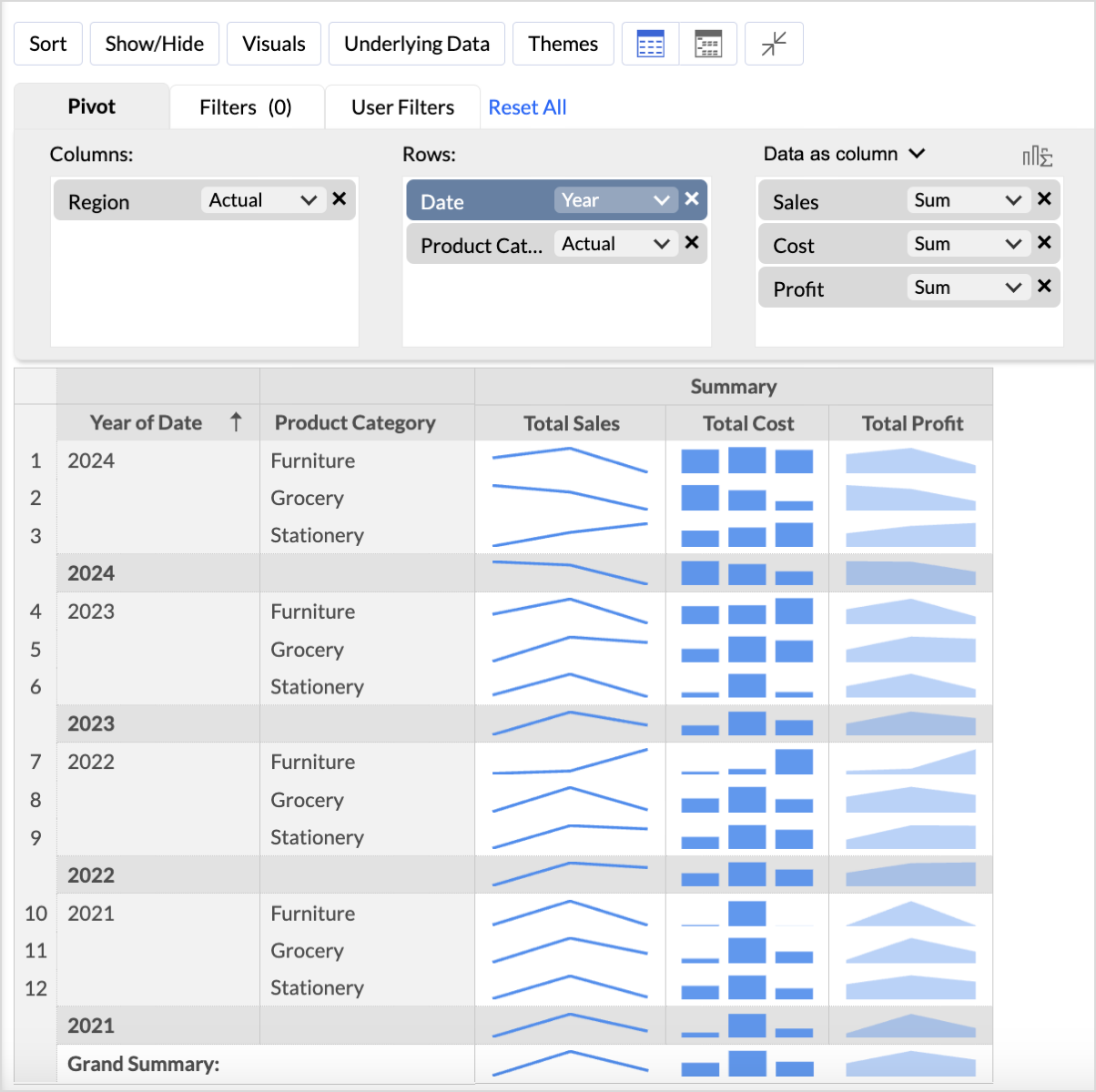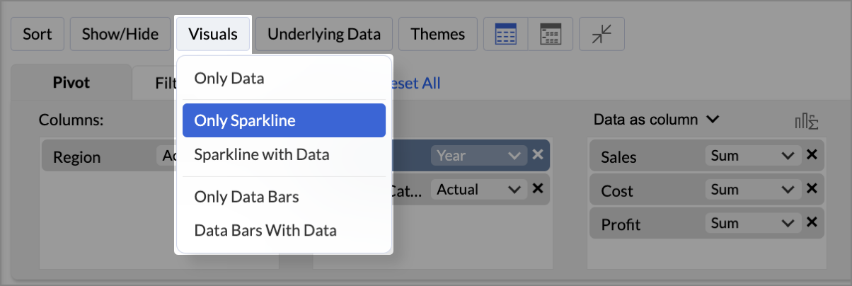 For instance, if Date(Year) and Date(Month) is dropped in the column shelf, then the the sparkline chart/Data Bar chart is shown across Months for each Year. - During export, only the HTML format supports the Sparkline chart and the Data Bars.