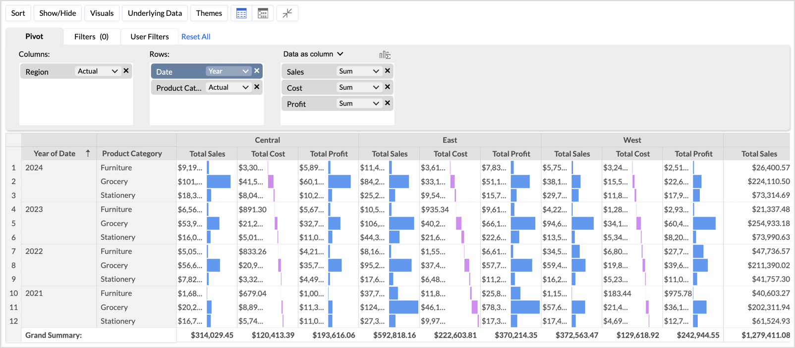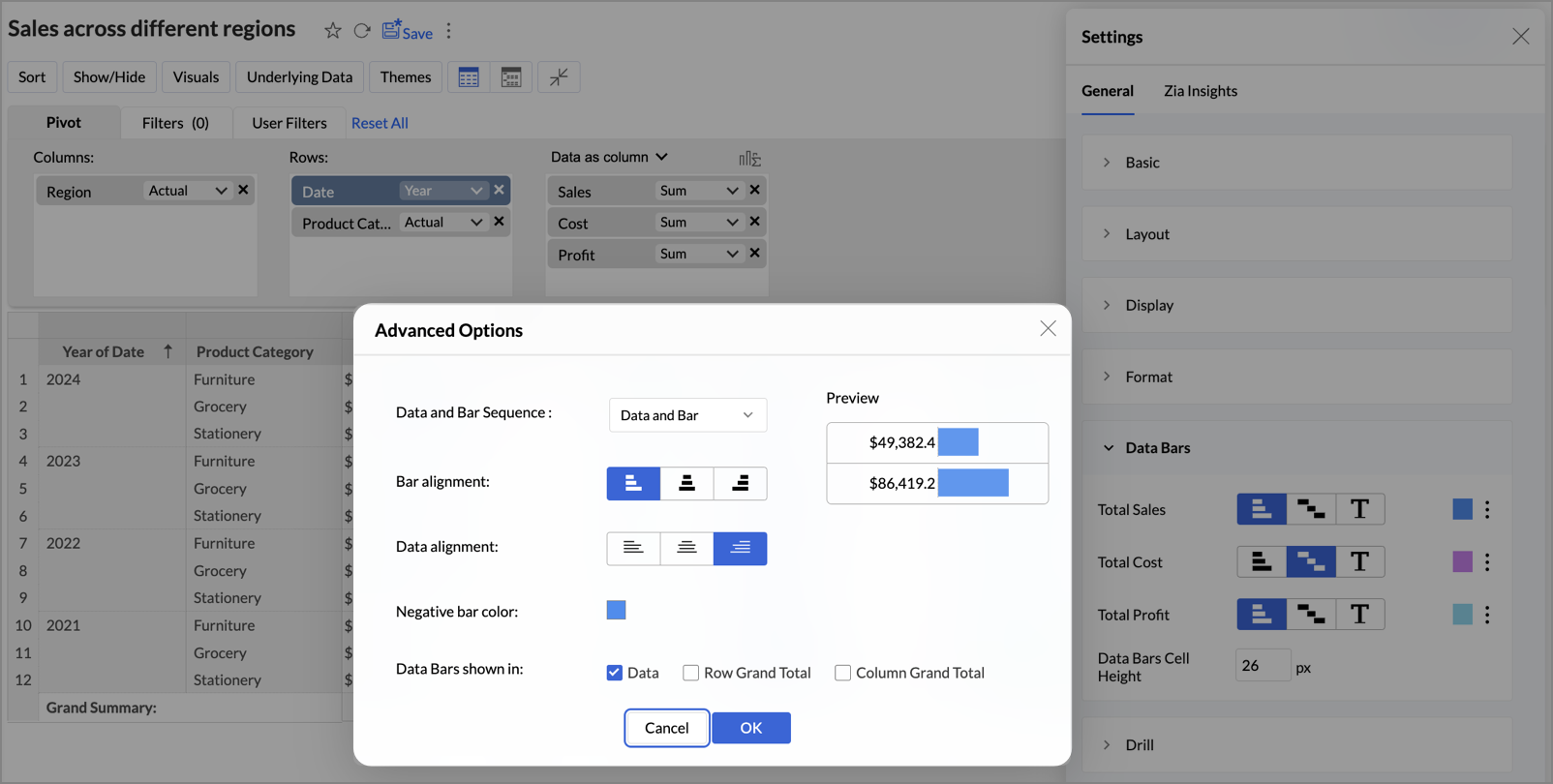 - Data Bars shown in: Select checkboxes to show Data Bars in Data, Row Grand Total, and Column Grand Total.
