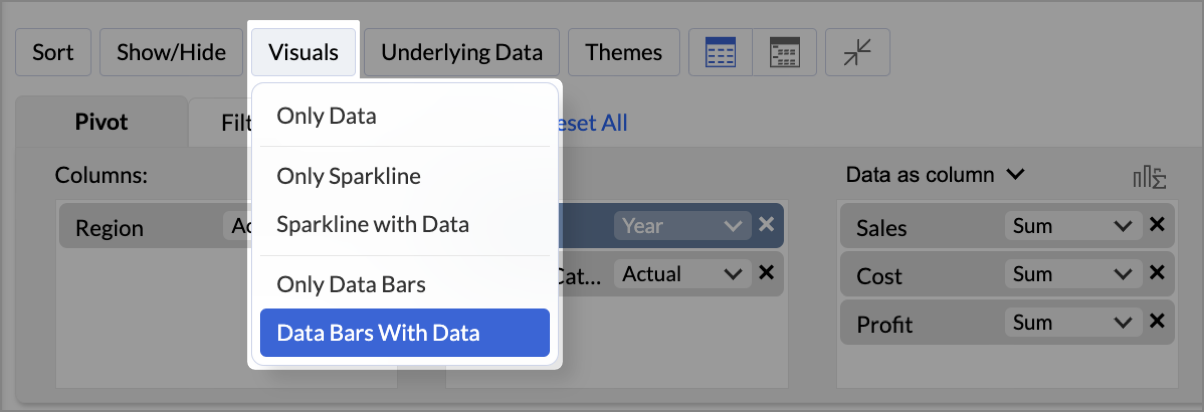 - Data Bars With Data - Displays both the Data and the Data Bars of the selected column.