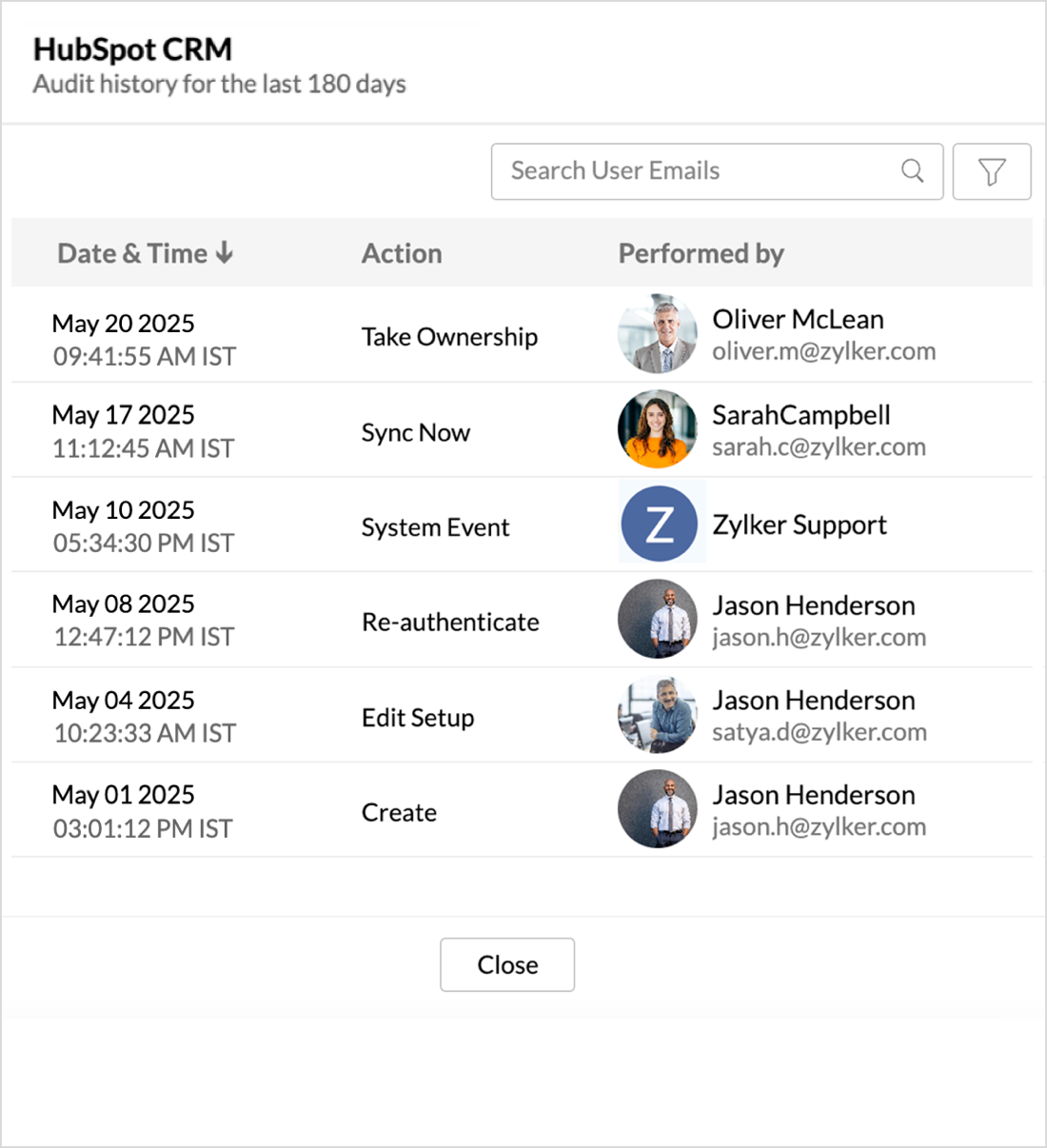 Zoho Analytics logs all the user activities and system events within the HubSpot CRM workspace. The following actions that are logged in Zoho Analytics,