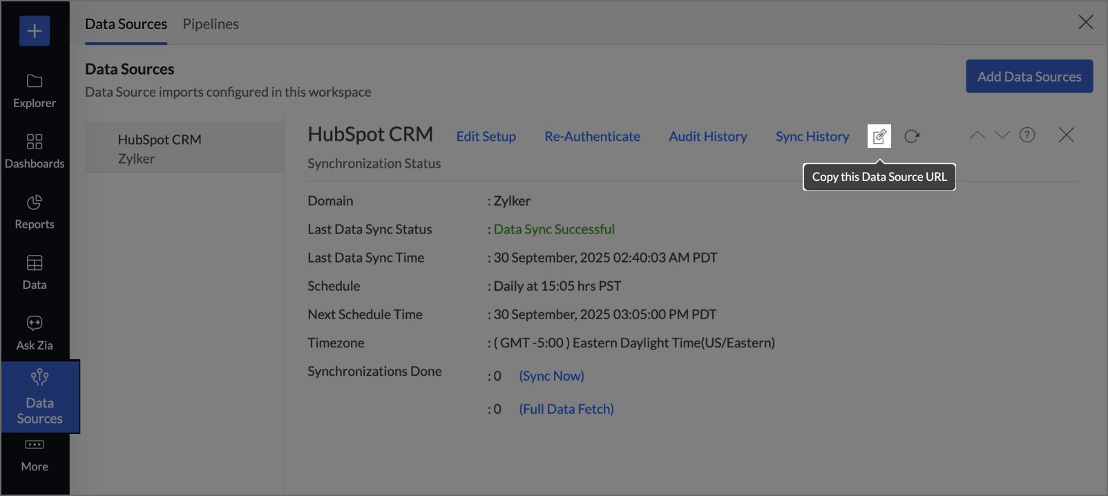 The Data Source Permalink helps you easily access the data source tab. Only the Organization Admin and Account Admin can make changes in the Data sources page, other users can know the synchronization details like whether the last data sync was successful or not, when the last data sync happened, when the next sync is scheduled to happen, etc. This link can also be pasted in dashboards so that everyone accessing the dashboard can know about the sync status.