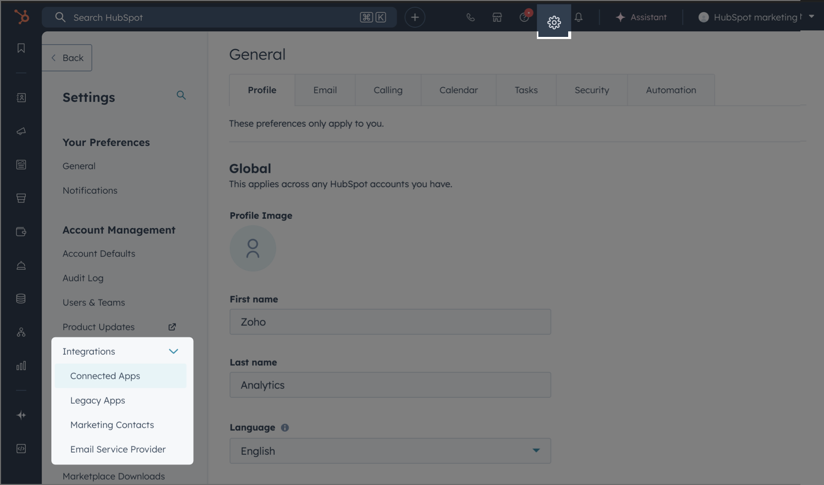 2. Click the Settings icon at the top. In the left side menu navigate to Integrations section > Connected Apps.