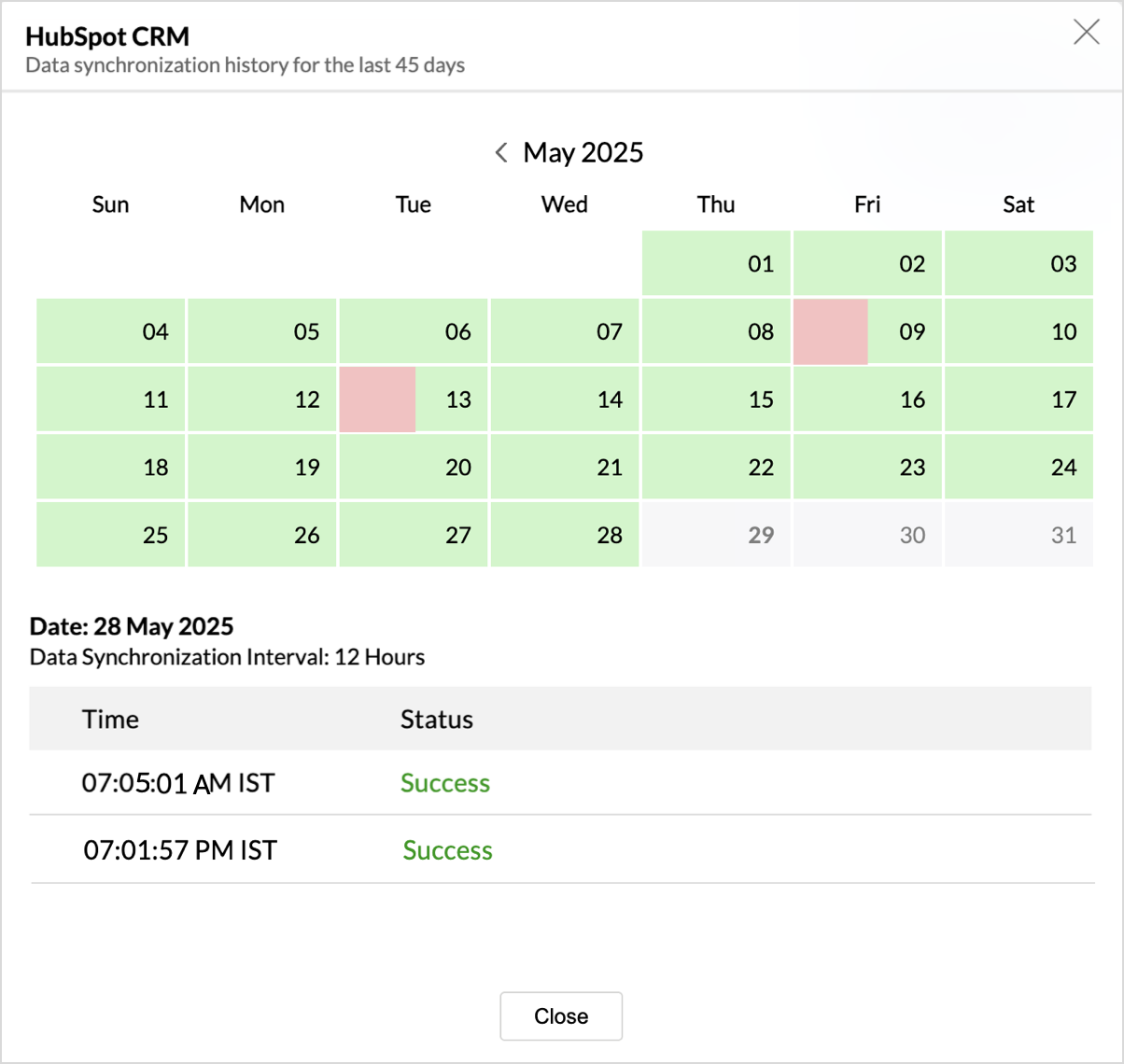 The Sync History tab provides details about the data sync for the last 45 days. A successful data sync is marked in green, and a sync failure is marked in red.