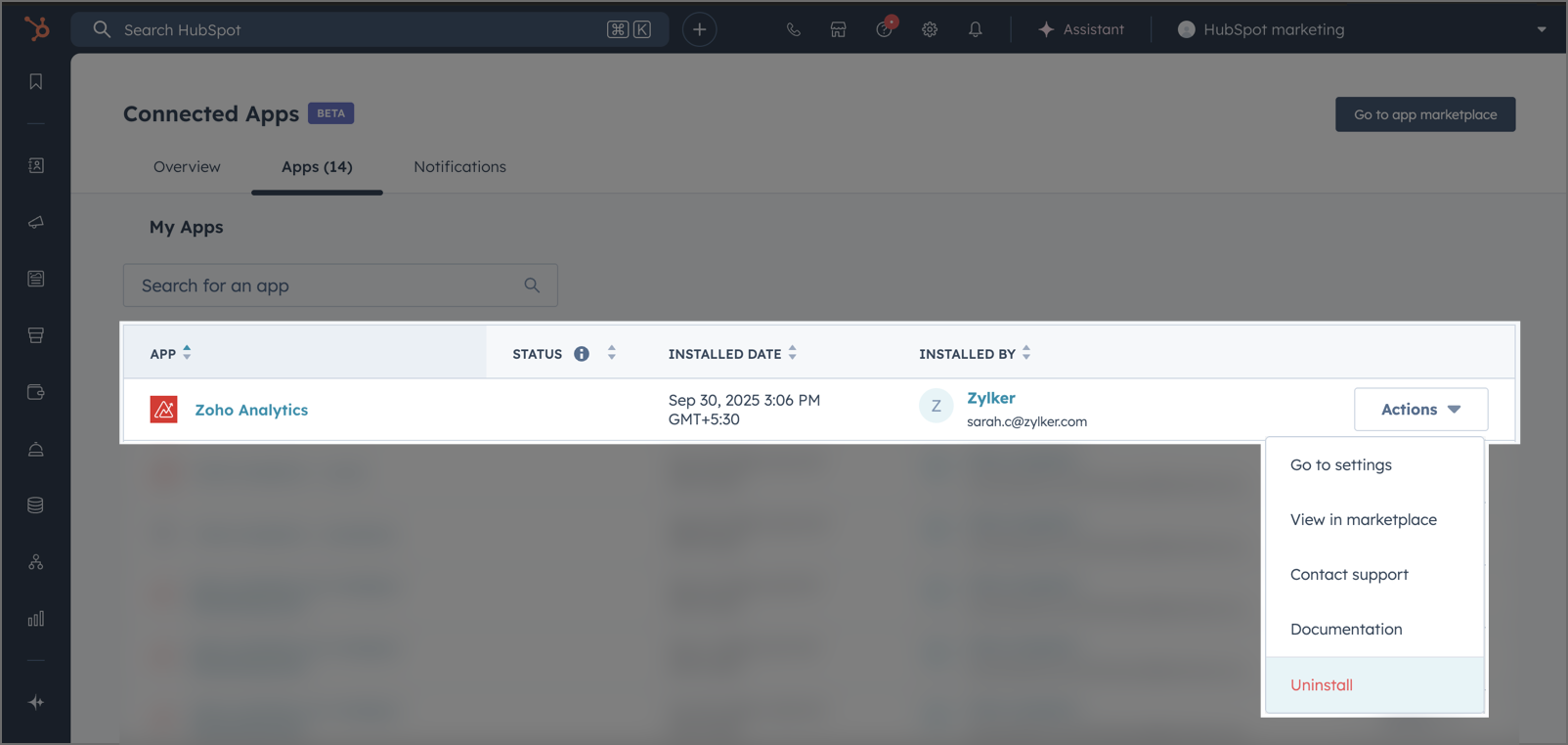 3. Find Zoho Analytics from the list. Click the Actions dropdown and select the Uninstall option.