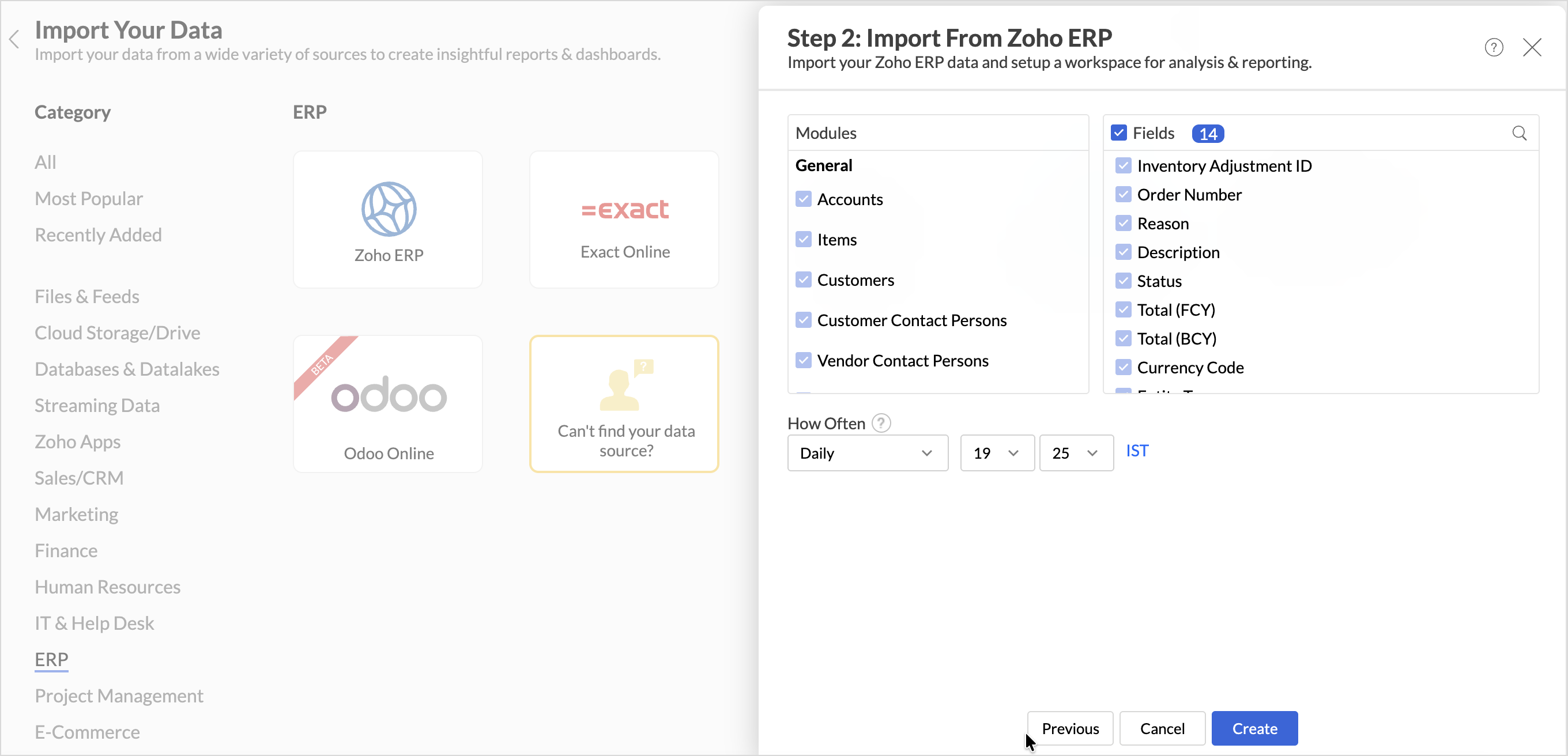 - All the data sources will be listed. Access the ERP tab and choose Zoho ERP.