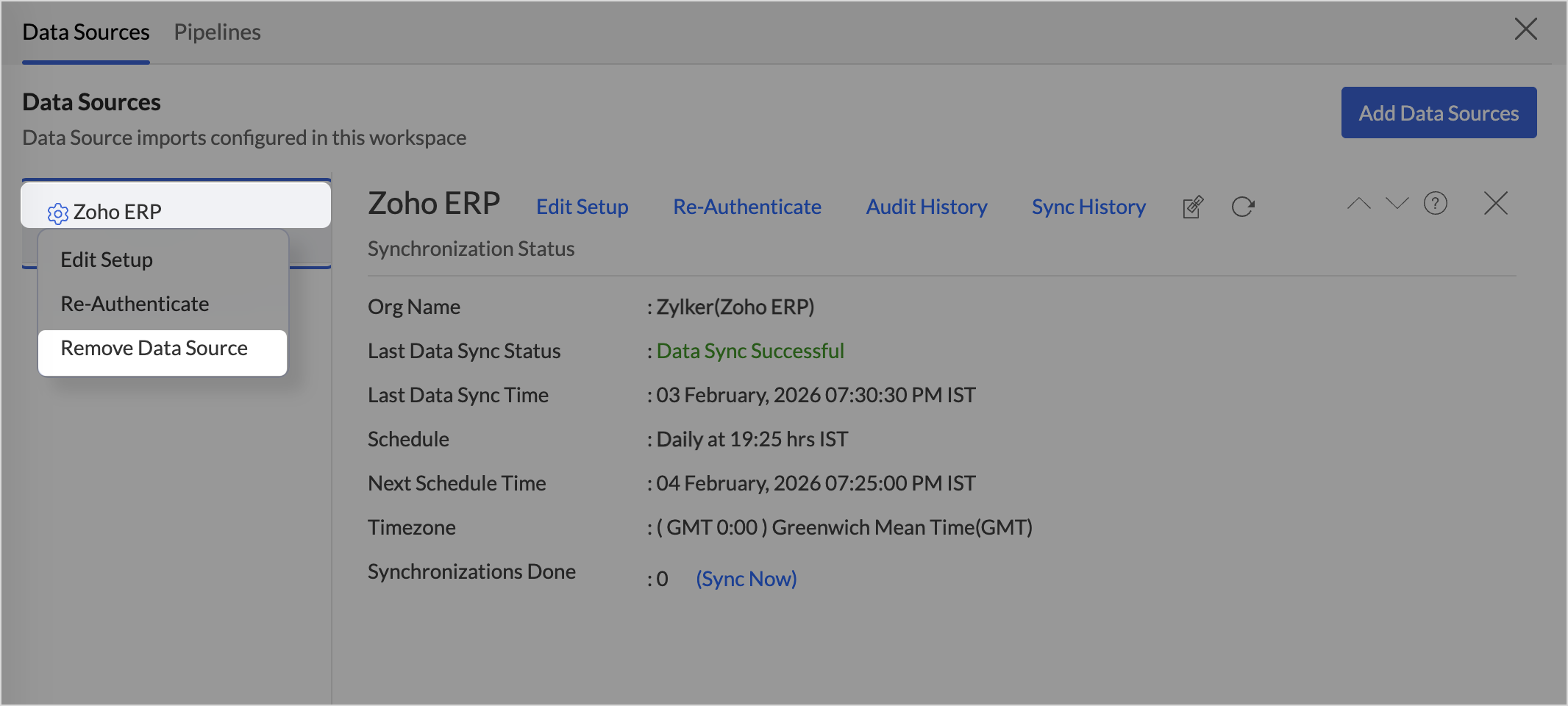 Zoho Analytics allows you to remove the integration if needed. Removing the integration will suspend further data synchronization. The data tables and the reports will be available.