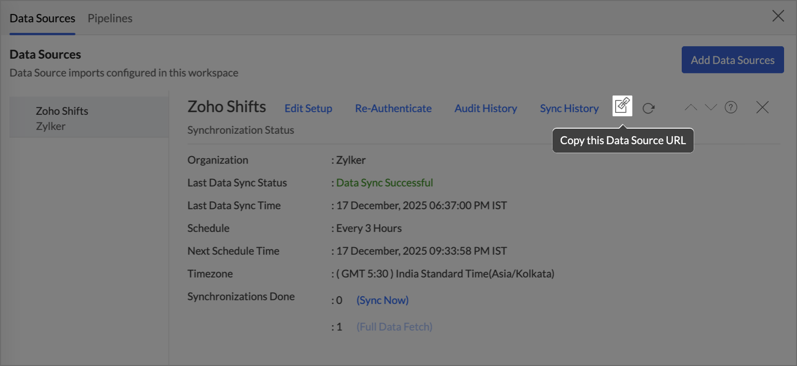 The Data Source Permalink helps you easily access the data source tab. Only the Organization Admin and Account Admin can make changes in the Data sources page, other users can know the synchronization details like whether the last data sync was successful or not, when the last data sync happened, when the next sync is scheduled to happen, etc. This link can also be pasted in dashboards so that everyone accessing the dashboard can know about the sync status.