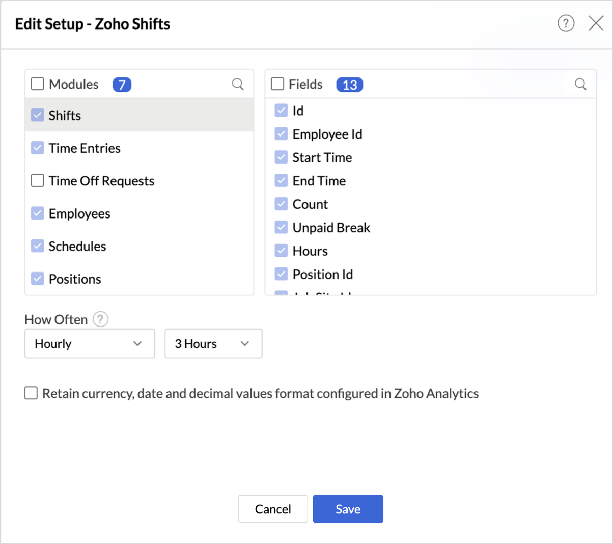 Modules & Fields (What are the modules and fields in Zoho Shifts that will be synchronized in Zoho Analytics Workspace?)