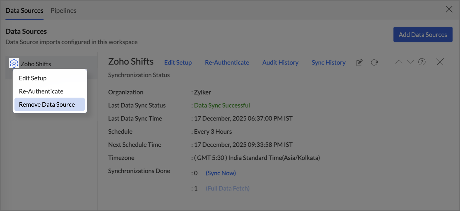 - The Full Data Fetch option can be used to sync all the changes made in the Zoho Shifts application, like datatype changes, or to resolve temporary sync issues.