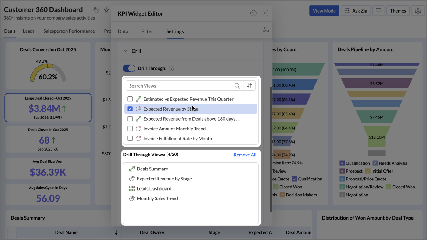 Zoho Analytics allows you to link widgets to related reports or dashboards, enabling users to drill through for deeper insights. This is achieved by enabling the Drill Through option and configuring the target reports or dashboards.