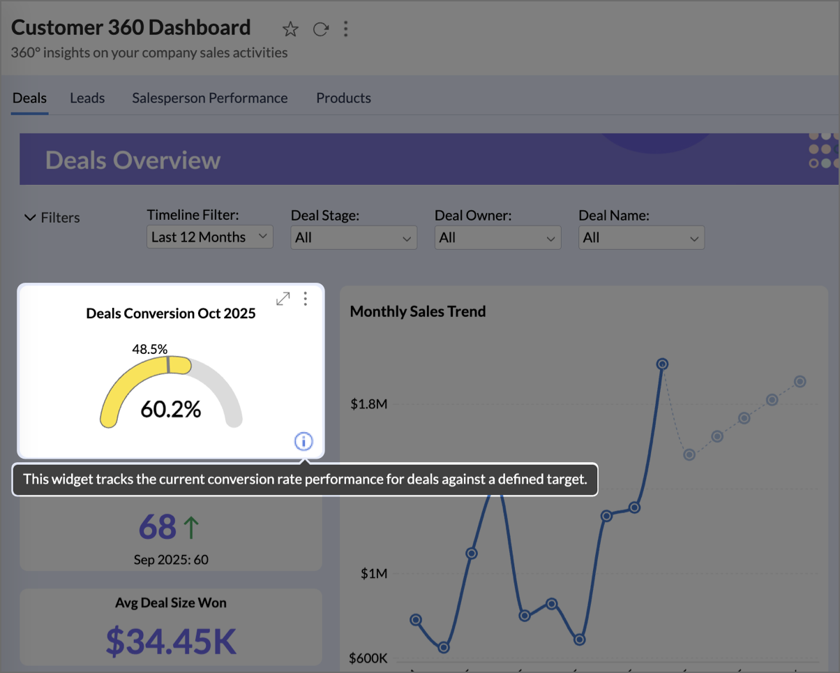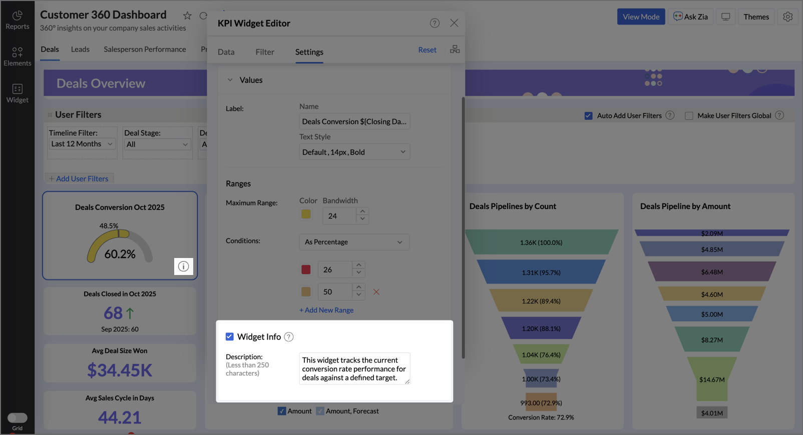 Zoho Analytics allows you to equip widgets with an informational tooltip. This is achieved by enabling an information icon and providing a concise description.