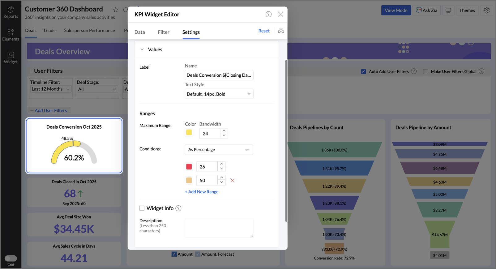 Zoho Analytics allows you to customize the Labels and Value for widgets. You can either leave it empty, enter a data, or add a dynamic label using a parameterized format. The following are the supported formats to add a dynamic label. Same parameter will retrieve different data based on the options set in the Show Value As option.