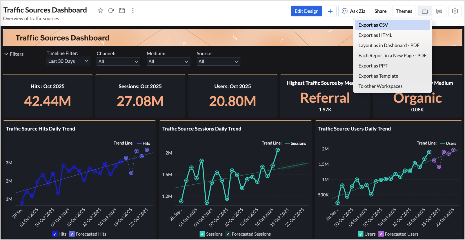 Zoho Analytics allows you to export your dashboards in various file formats. Follow the below steps to export any dashboard.