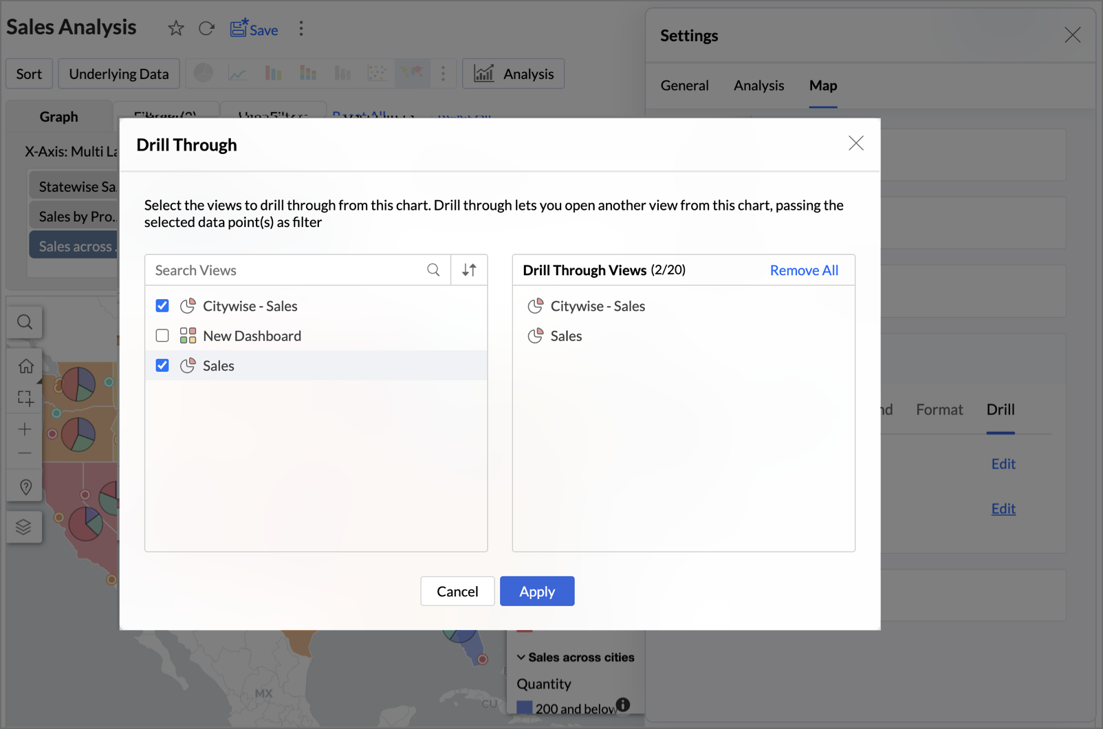 For example, if you have a layer showing Total Sales by State and another showing Product Category Sales by State, you can configure a drill-through to a City-wise Sales report. This helps you see which cities perform best and which product categories lead in that region.