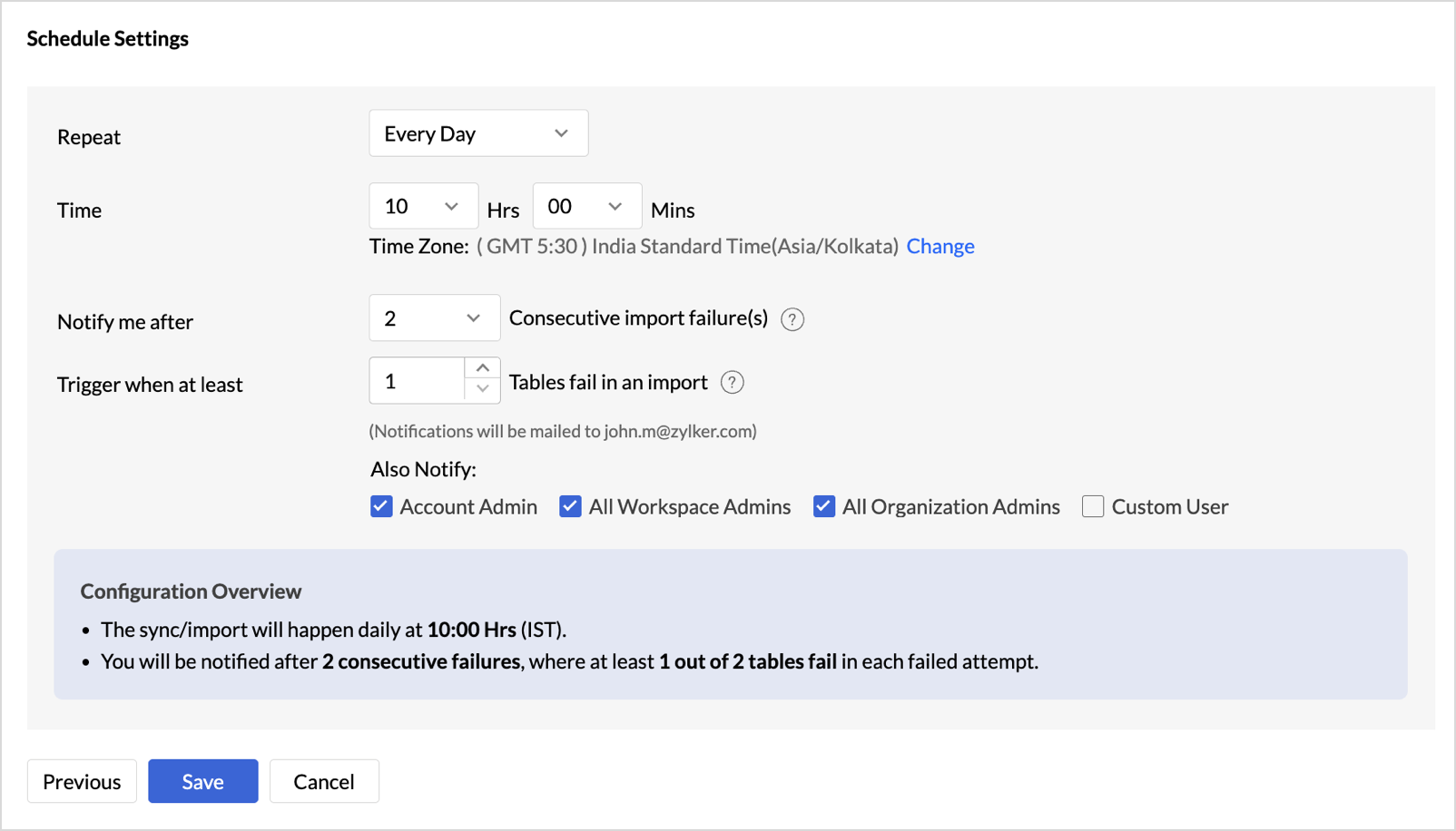 - In the case of continuous import errors, you can choose to be notified via email. To get notifications, select the interval at which you need to be notified from the Notify me after every drop-down menu.