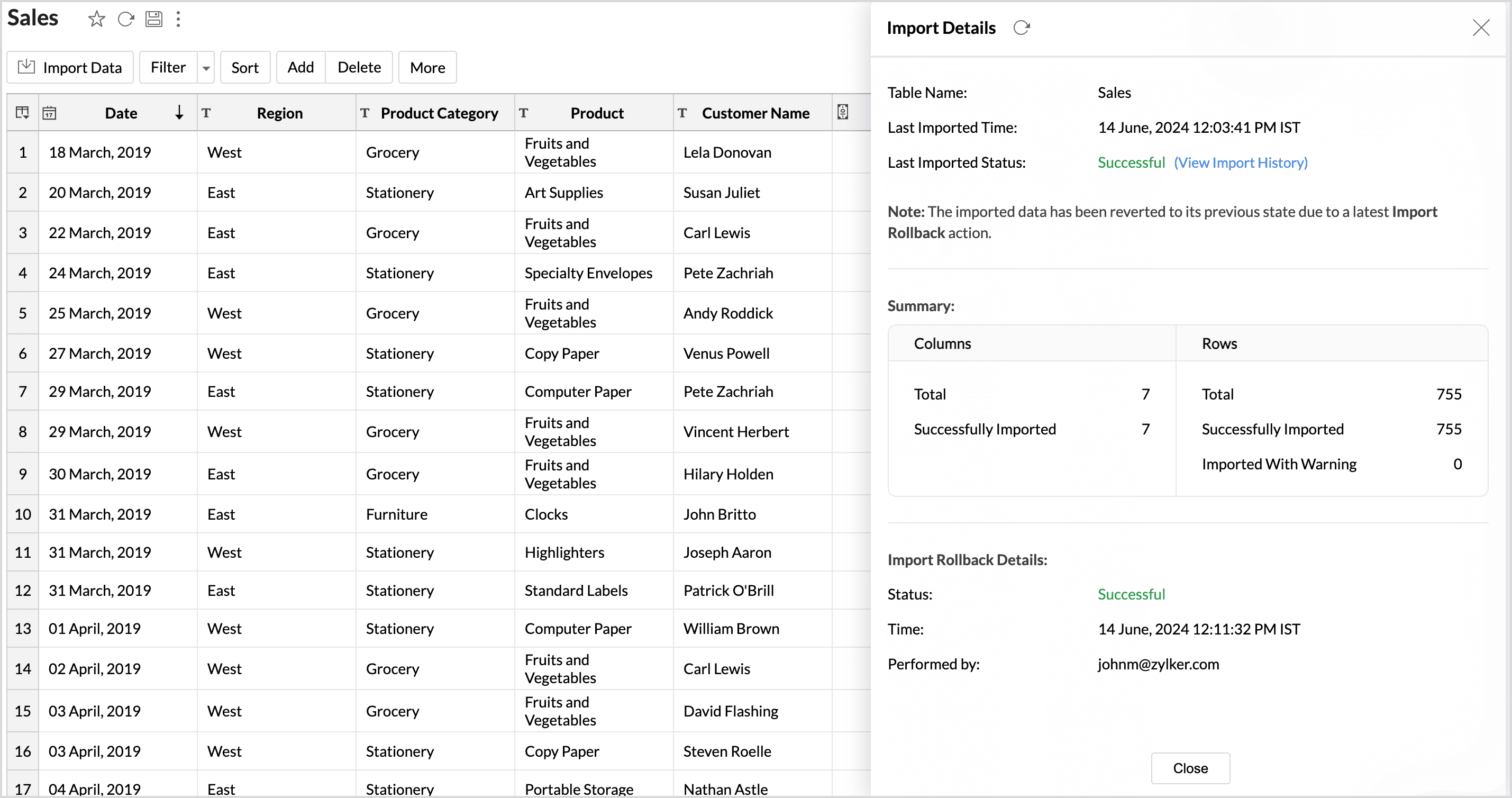 Import rollback reverts the most recent data import to the previous version. Users with administrator privileges and custom role users with permission to create tables can perform this action. Rollback facilitates the correction of errors in data without disrupting operations and also minimizes data loss. It is useful in collaborative environments where multiple users access the data and make changes.