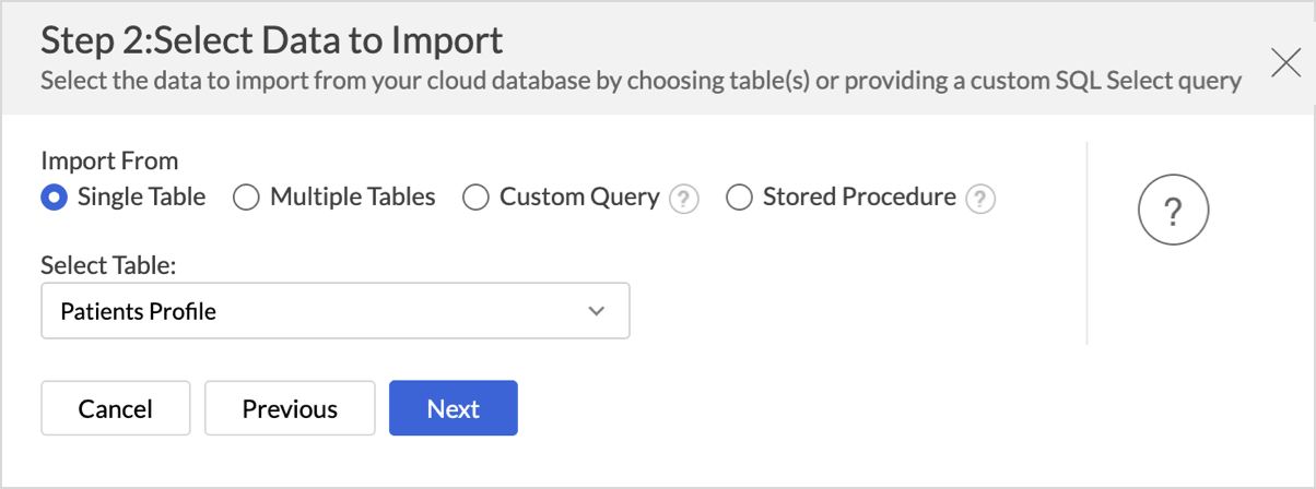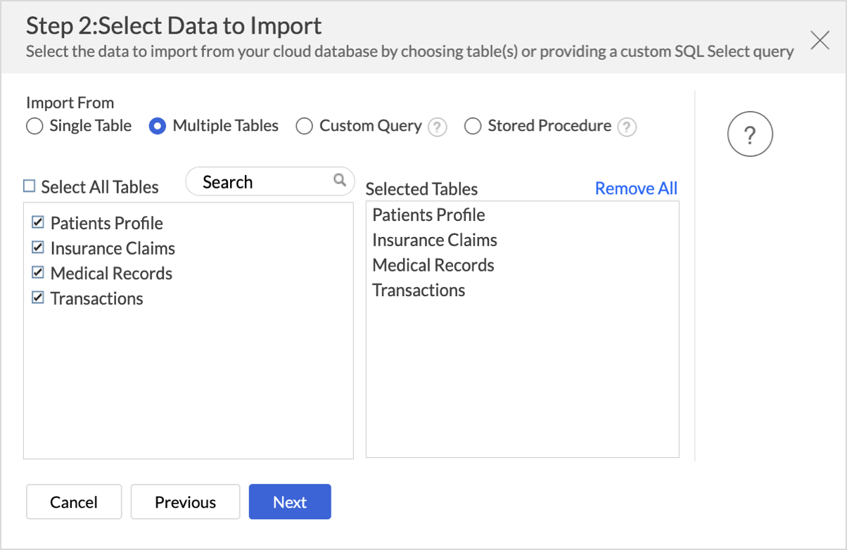 Once the connection details are configured, you need to decide which data you want to import from Azure Managed Instance. Zoho Analytics offers a range of import options, including Single Table, Multiple Tables, Custom Query, and Stored Procedure to support various data structures and analysis needs.