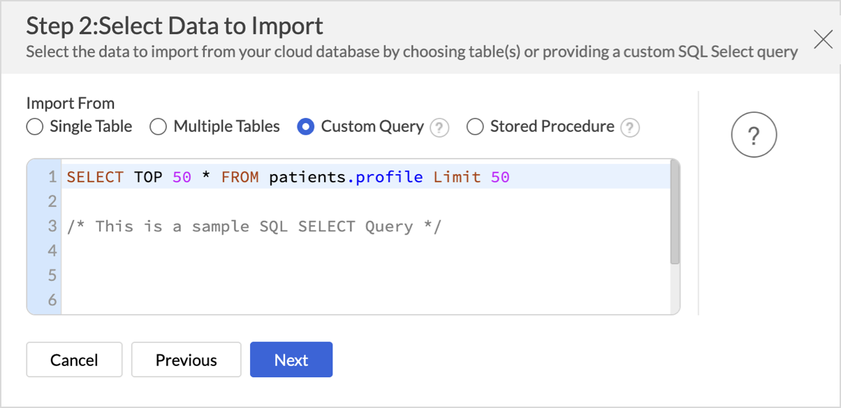 - Select the Custom Query option and provide the SQL SELECT query in the given text area.
