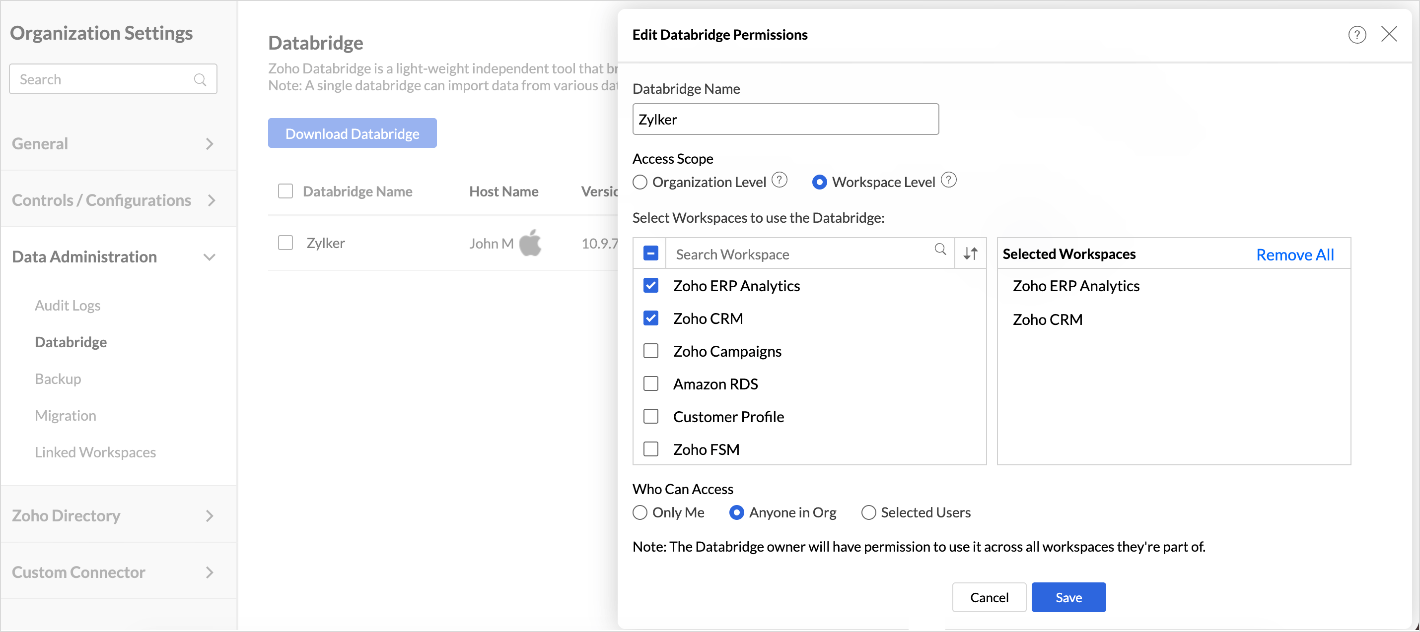 Zoho Analytics allows you to manage Databridge access by defining the level at which it can be used and who can use it for importing data into workspaces.