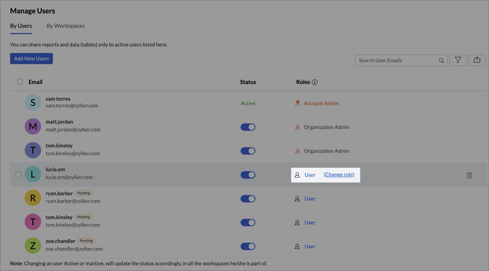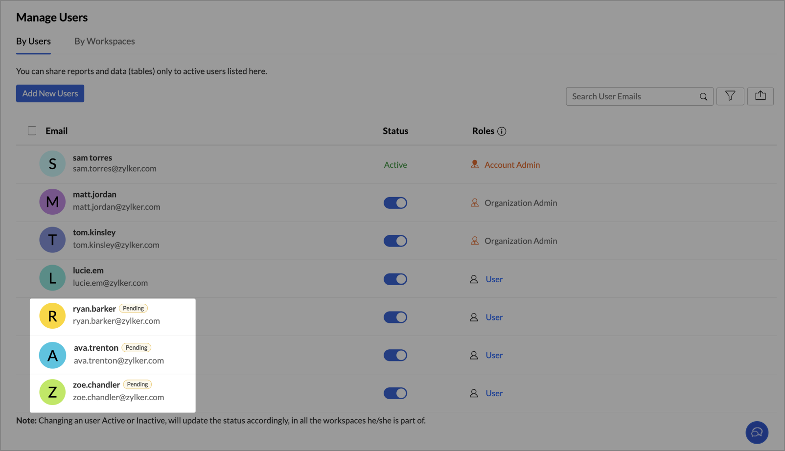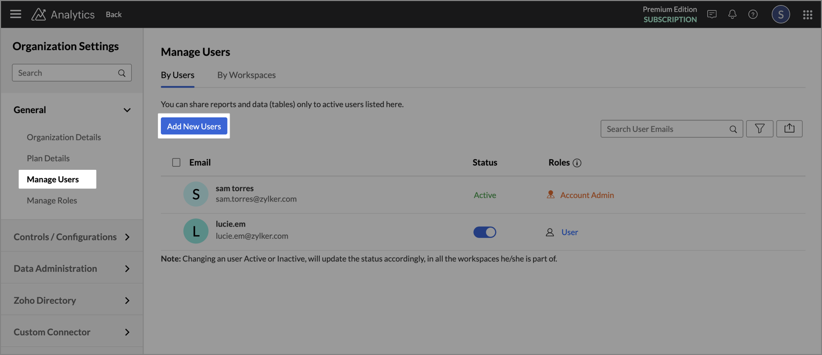 You can manage all users in your Zoho Analytics organization from the Manage Users tab in the Organization Settings page.