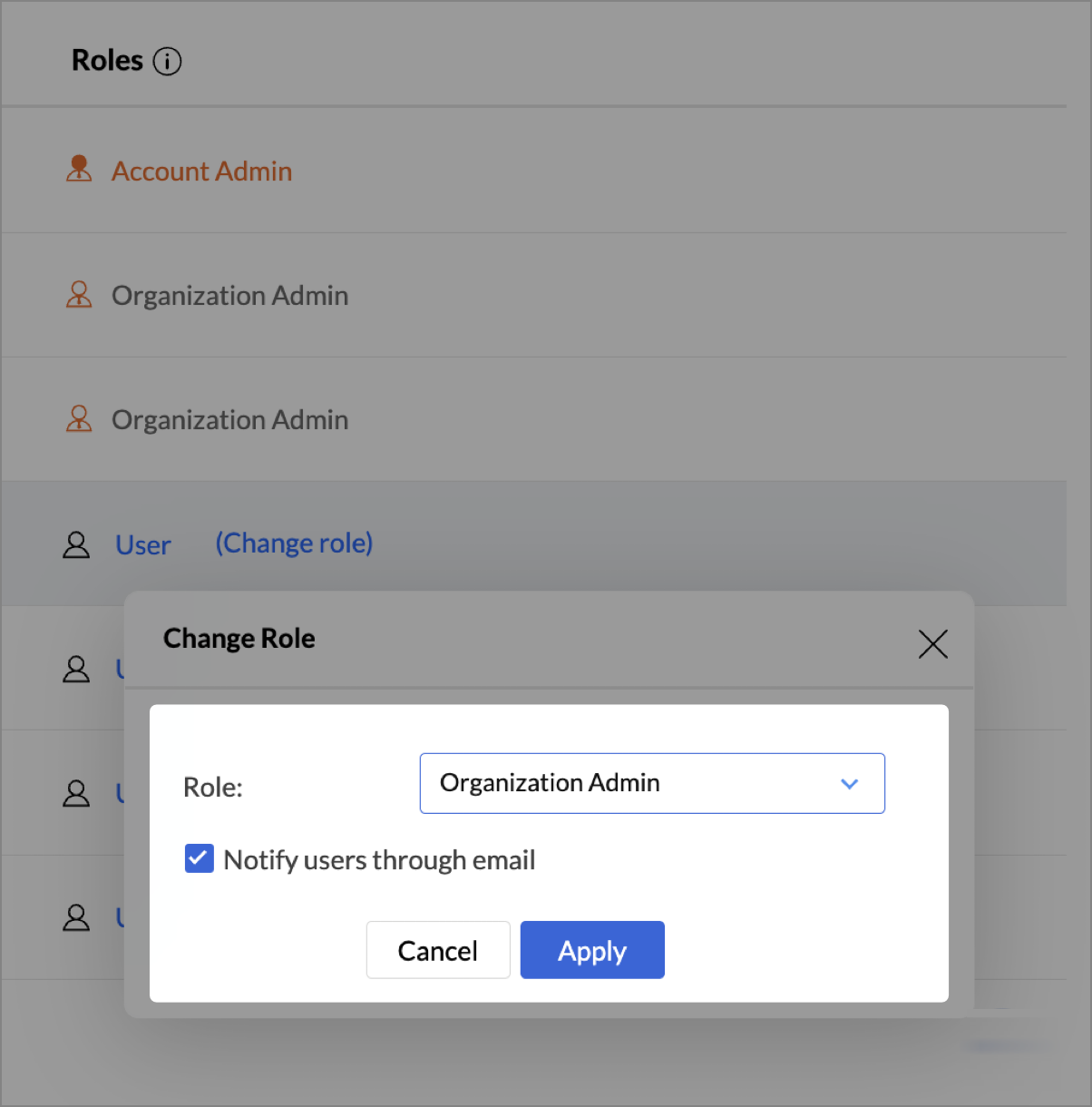 - Select the new role (User, Viewer, Org Admin) from the drop-down.