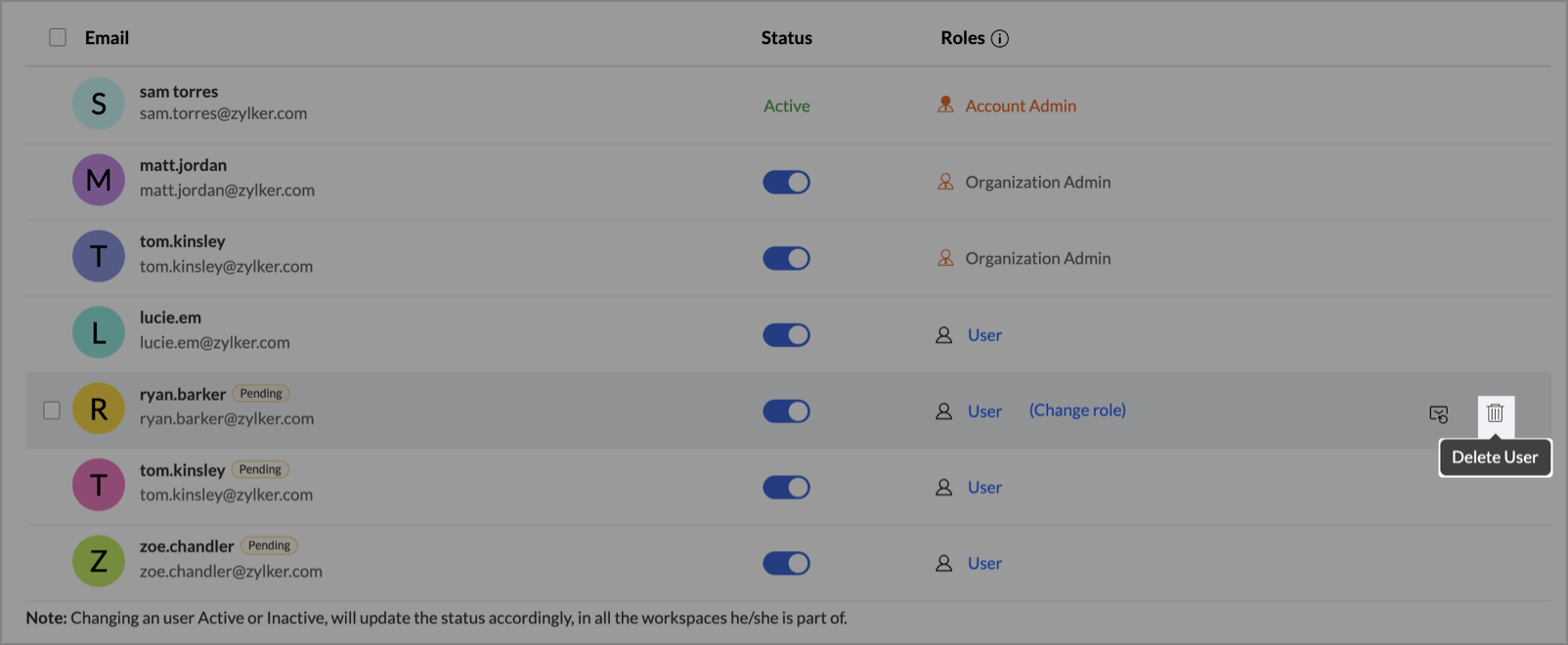 - When toggled off, the user is deactivated and cannot access the organization.