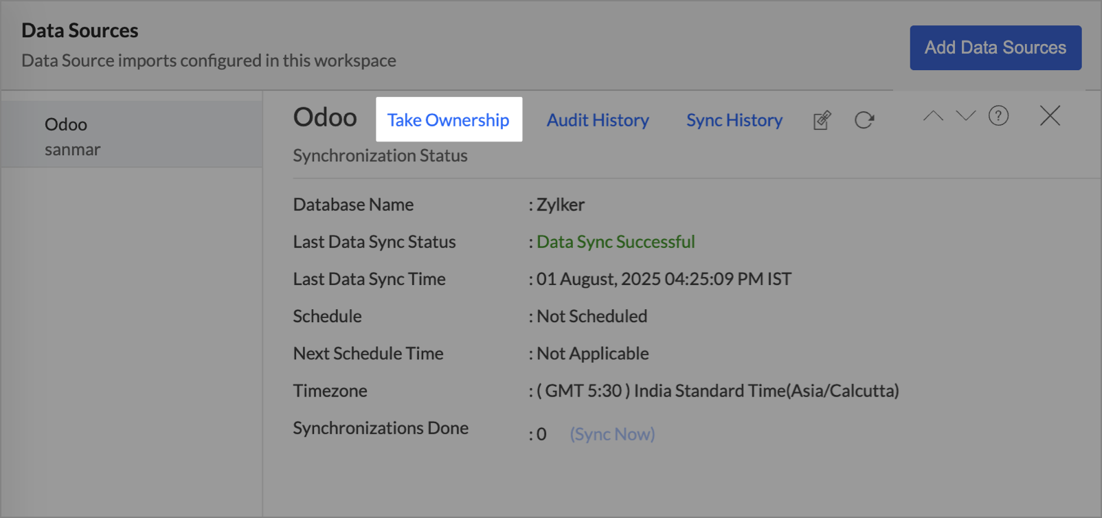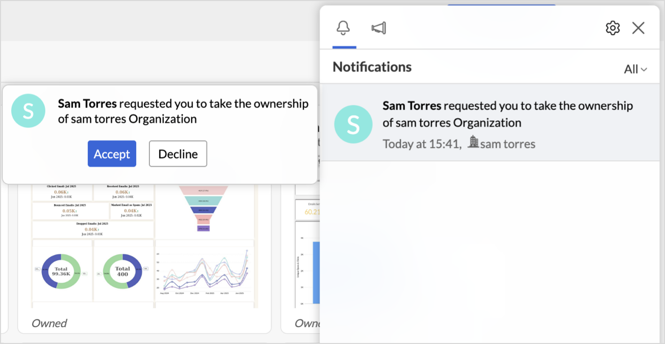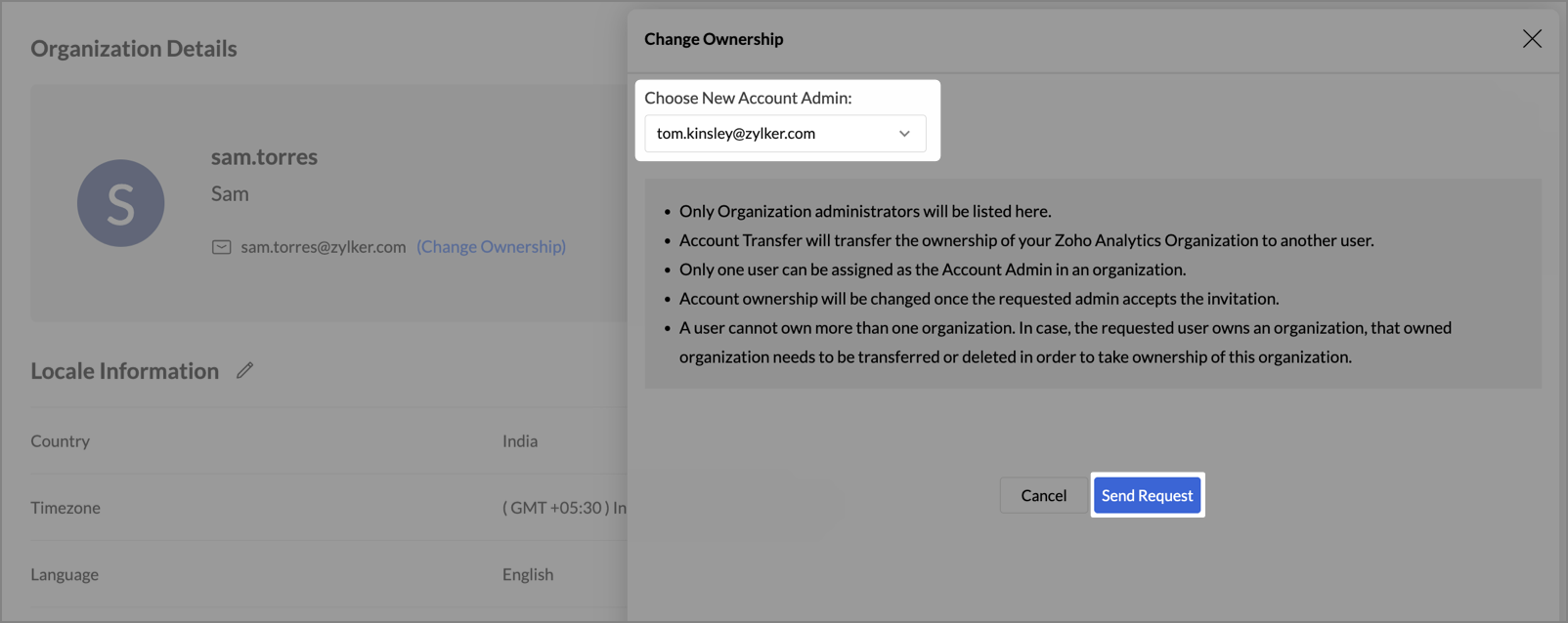 Zoho Analytics allows the transfer of account ownership when the Account Administrator needs to step down or no longer has access. Ownership can only be transferred to an Organization Administrator within the same organization.