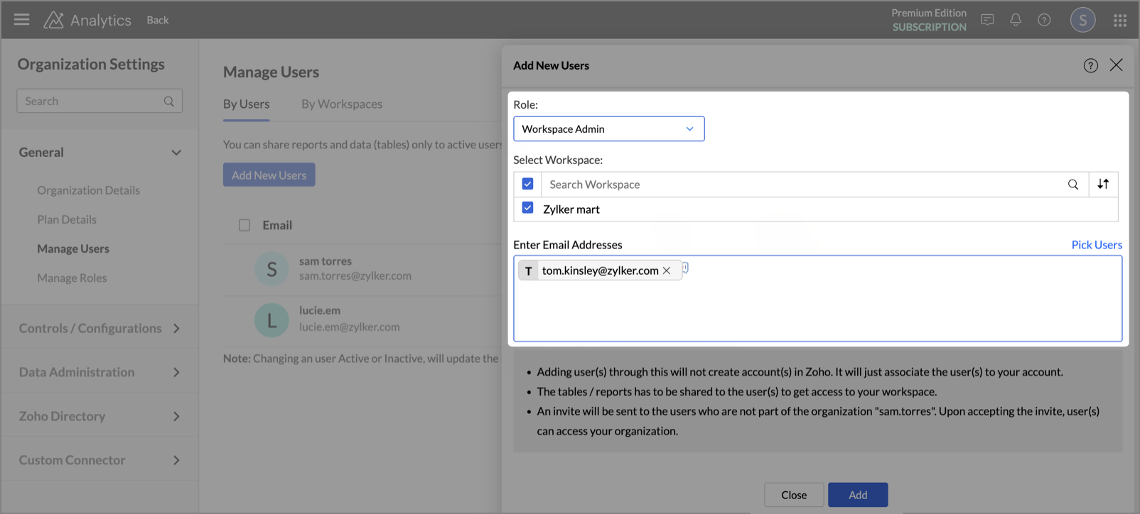 You can add users to your Zoho Analytics organization from the Manage Users tab under Organization Settings.Depending on your workflow, you can invite users in one of the following ways: