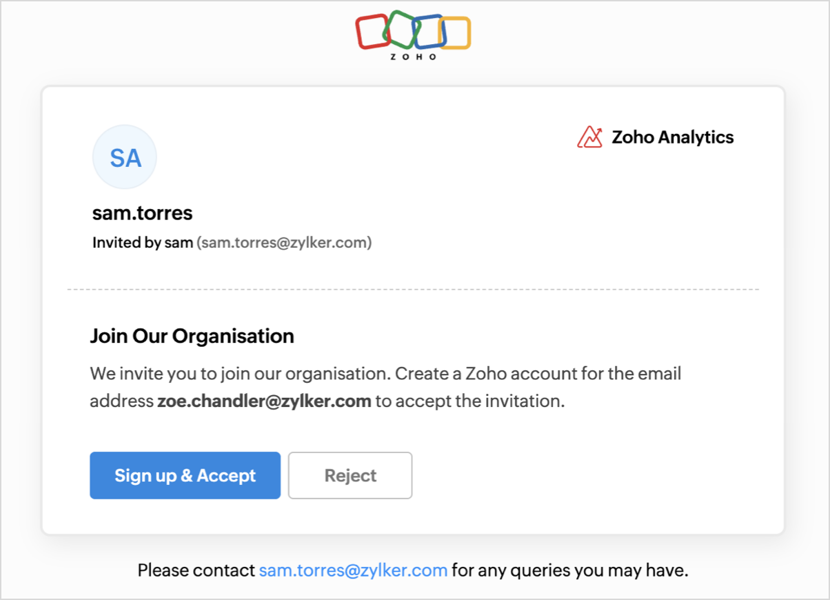 - If the user is new to Zoho analytics, clicking Join Organization takes them to a page where they’re presented with two options: Sign up & Accept or Reject.