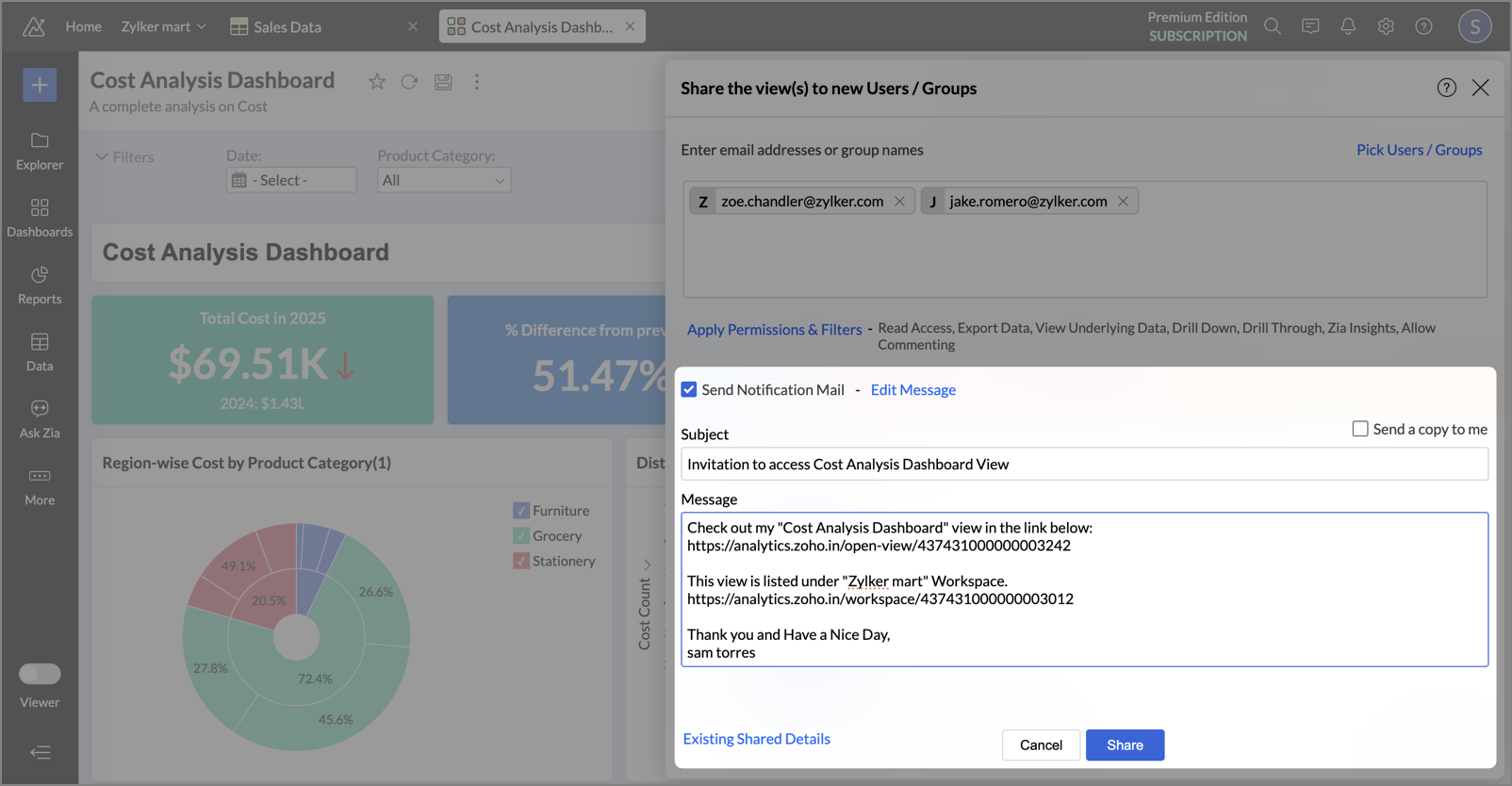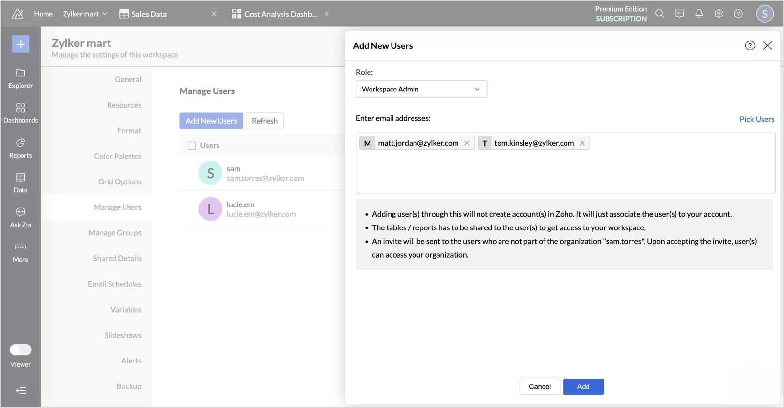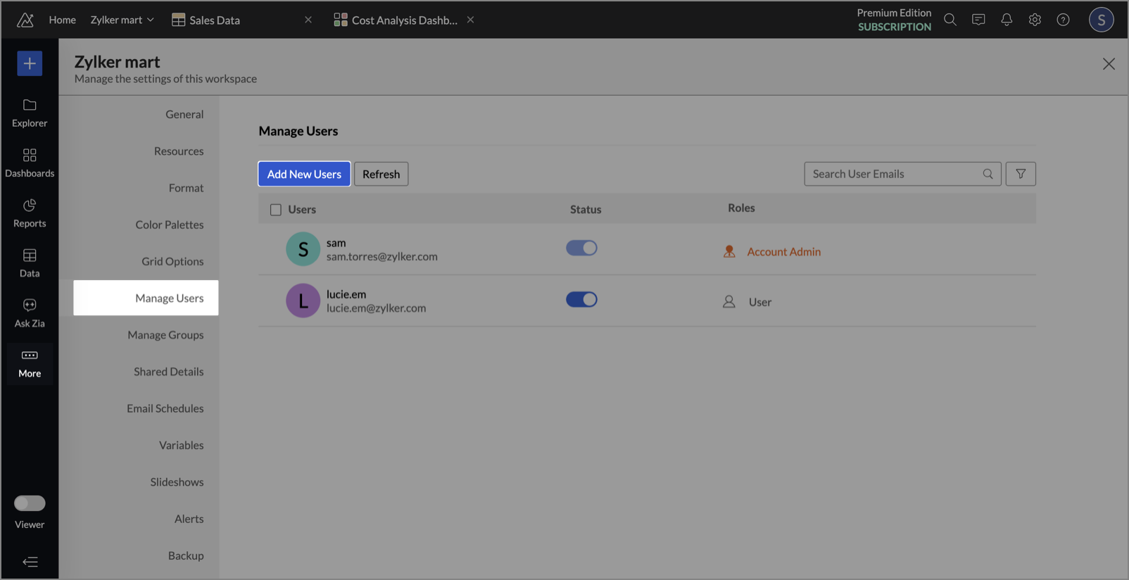 Zoho Analytics allows you to add and manage users with different roles to collaborate effectively within your organization. The number of users you can add depends on your subscription plan.