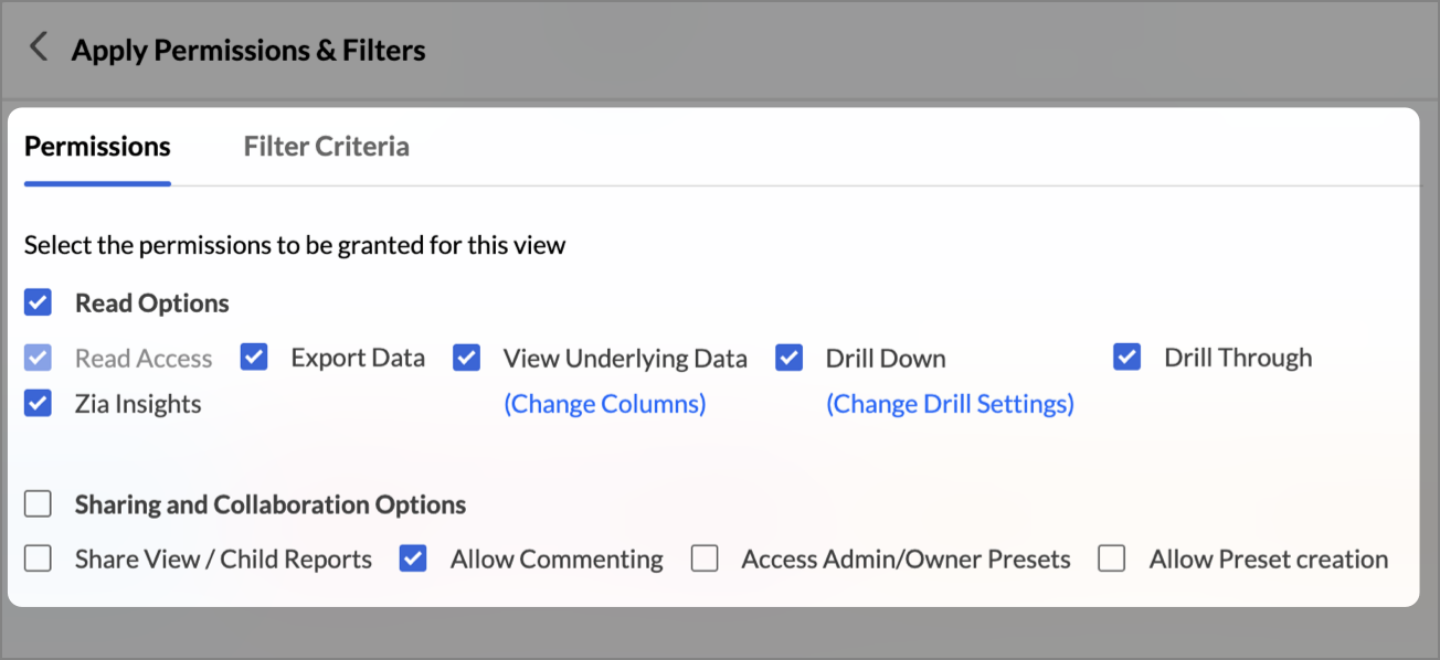 - Choose the access Permissions (Read, Export, Share etc.) and apply Filter Criteria if needed.