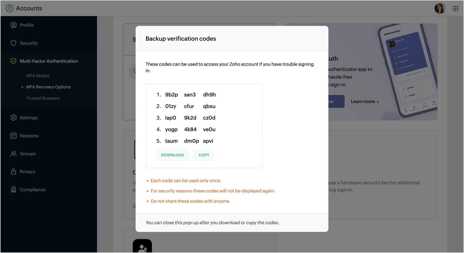Note: The backup codes dialog appears automatically after MFA setup. Codes are visible only once—save them immediately.