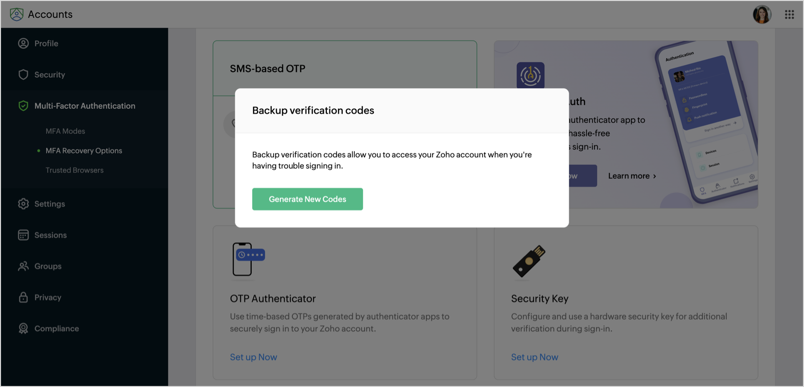 - In the Zoho Accounts page, go to Multi-Factor Authentication in the left sidebar.