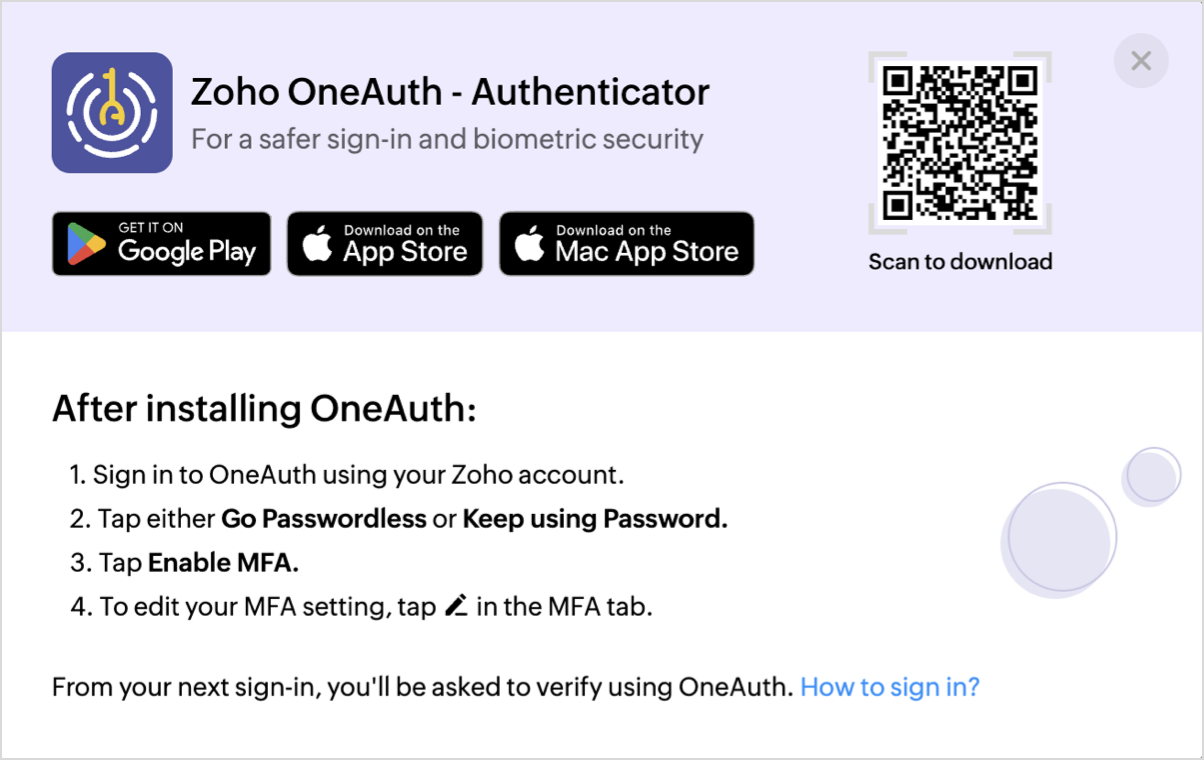 Zoho OneAuth offers powerful authentication features including password-less login, OTP verification, and mobile SSO for all Zoho apps. With multi-device support, multiple account protection, and easy recovery options, it provides both security and convenience. It's available for both Android and iOS.