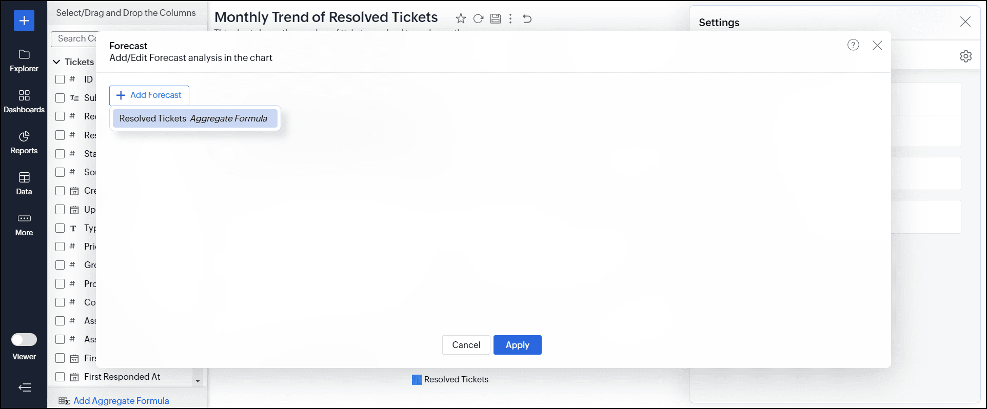 - In the dialog that appears, click the + Add Forecast button and choose the column for which you intend to forecast values.