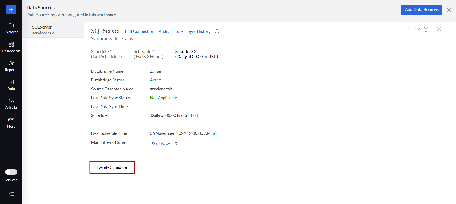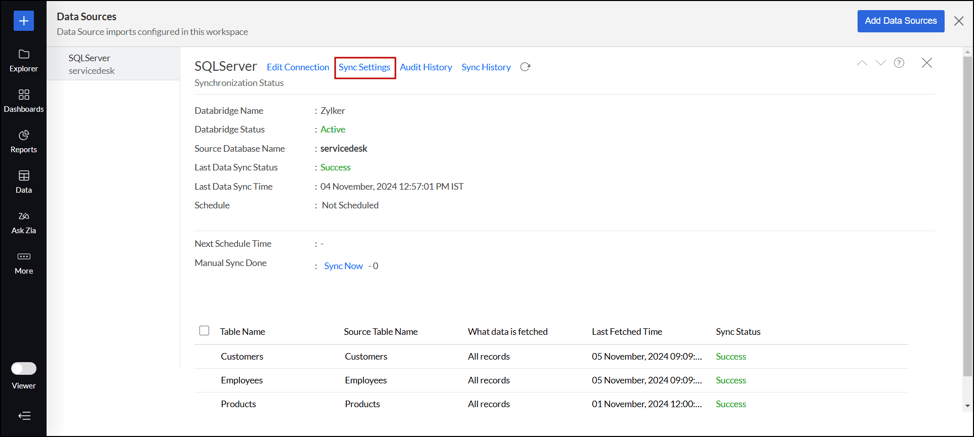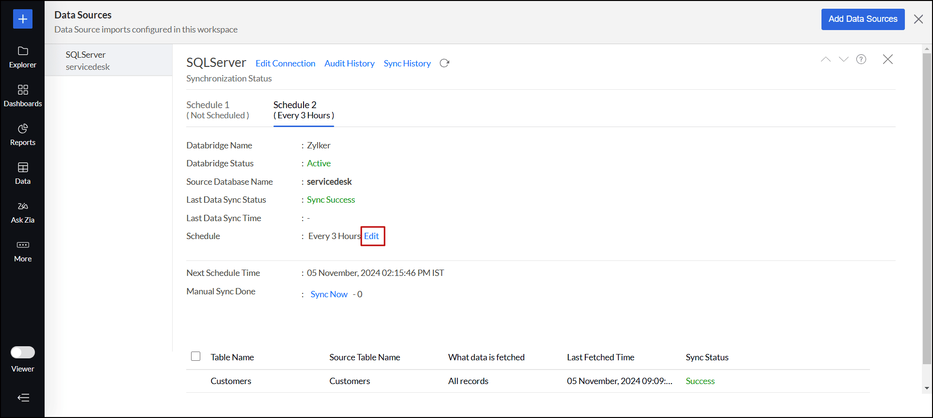 Zoho Analytics enables you to set different synchronization intervals for tables of the same data source, offering the flexibility to customize data synchronization schedules based on the unique update frequency of individual tables. For example, some tables can be configured to sync every hour, while others can be set to sync daily or weekly, based on your specific needs.