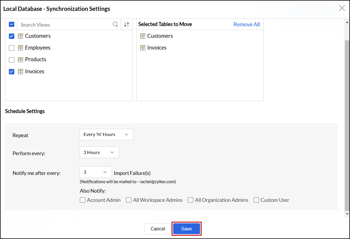 - Select a number from the Notify me after every 'N' Sync Failure(s) drop-down to receive notifications after the specified number of consecutive import failures. You can also notify the Account Admin and all the Workspace Admins, Organization Admins, and Custom Users of the change in sync schedules.
