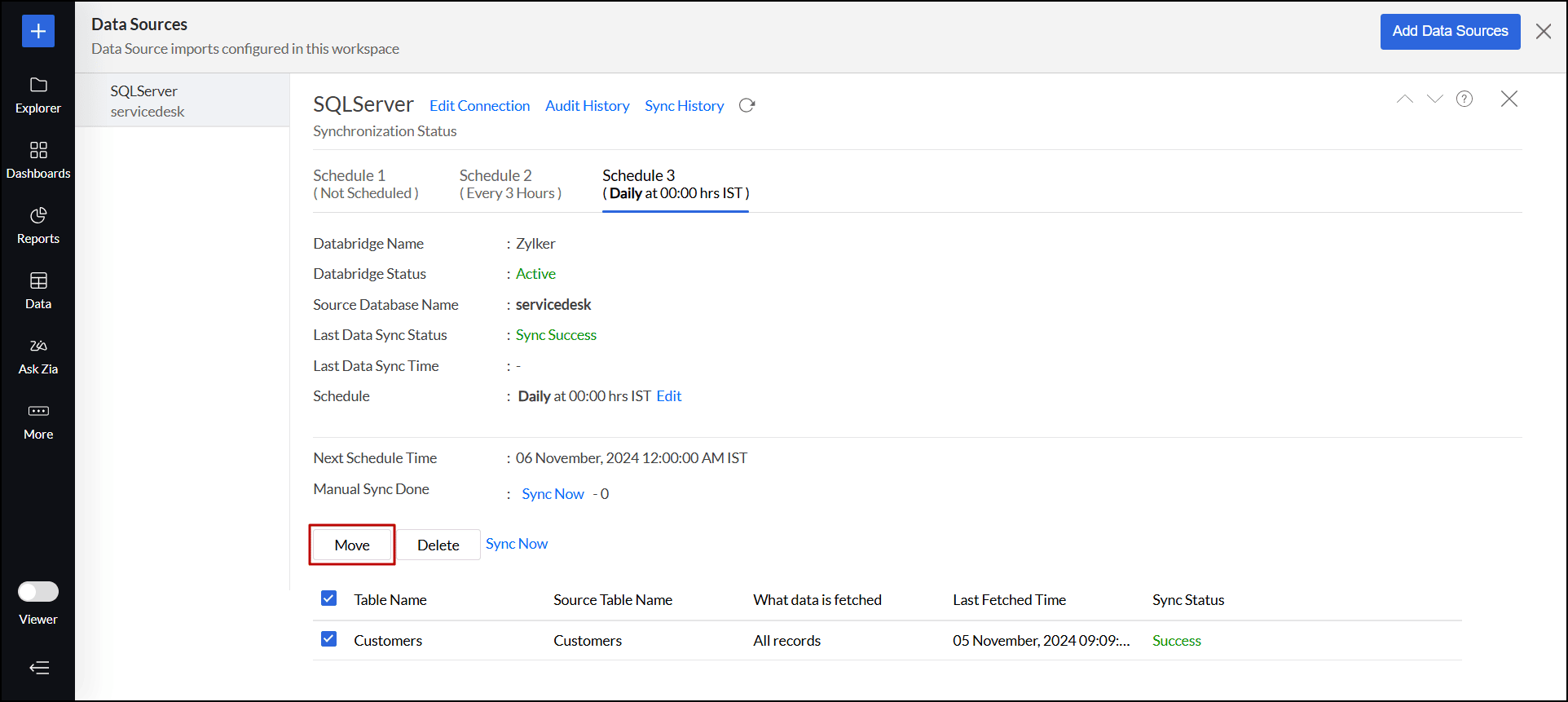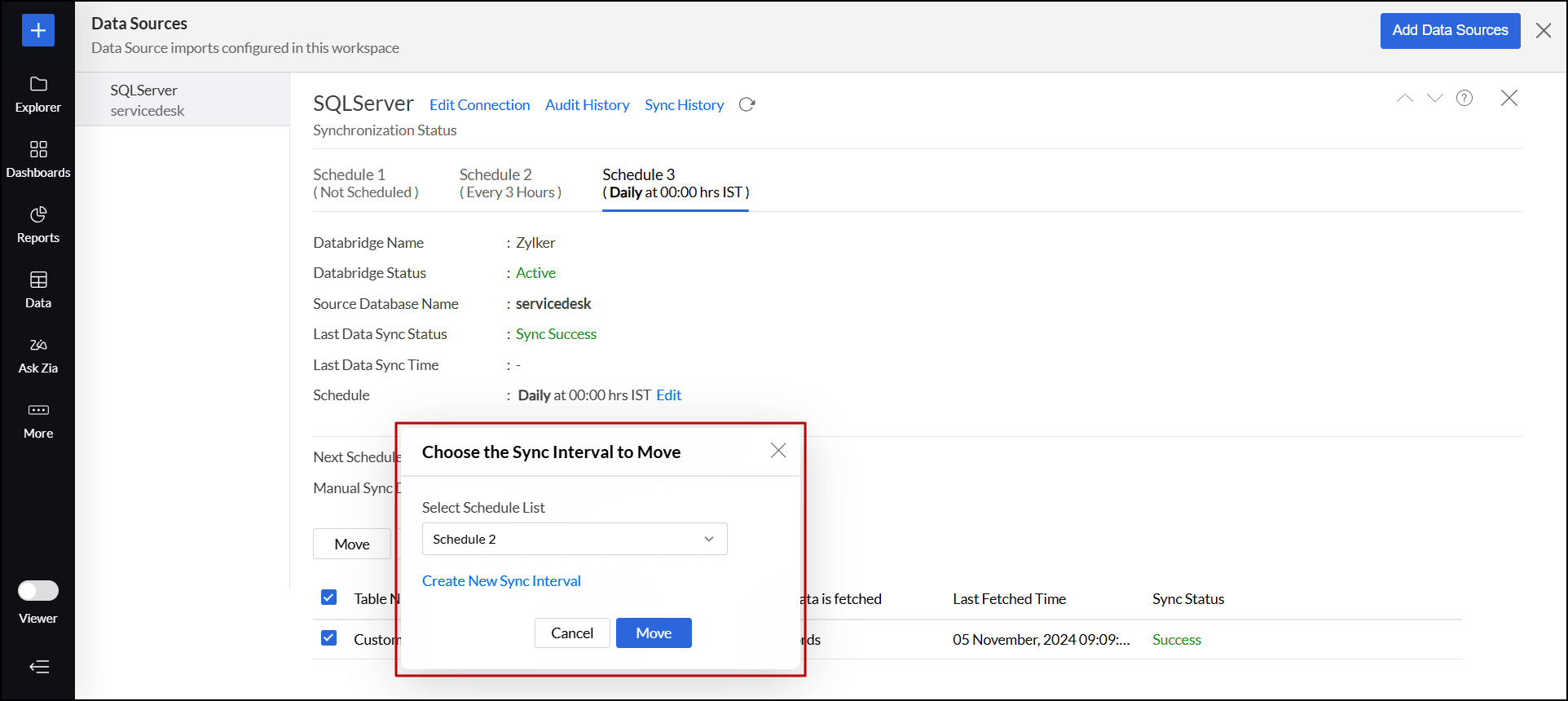 Zoho Analytics allows you to transfer tables from one synchronization schedule to another. Follow the steps below to do this: