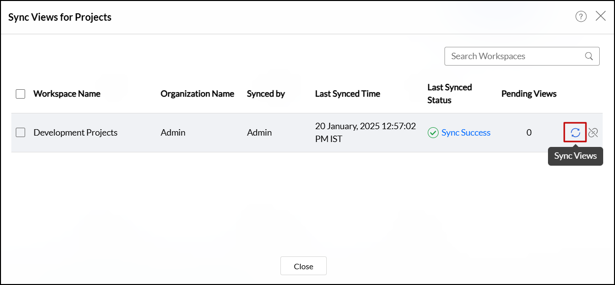 - In the dialog that appears, all the secondary workspaces are listed with details such as Workspace Name, Synced by, Last Sync Status, Last Sync Time, and Pending Views.