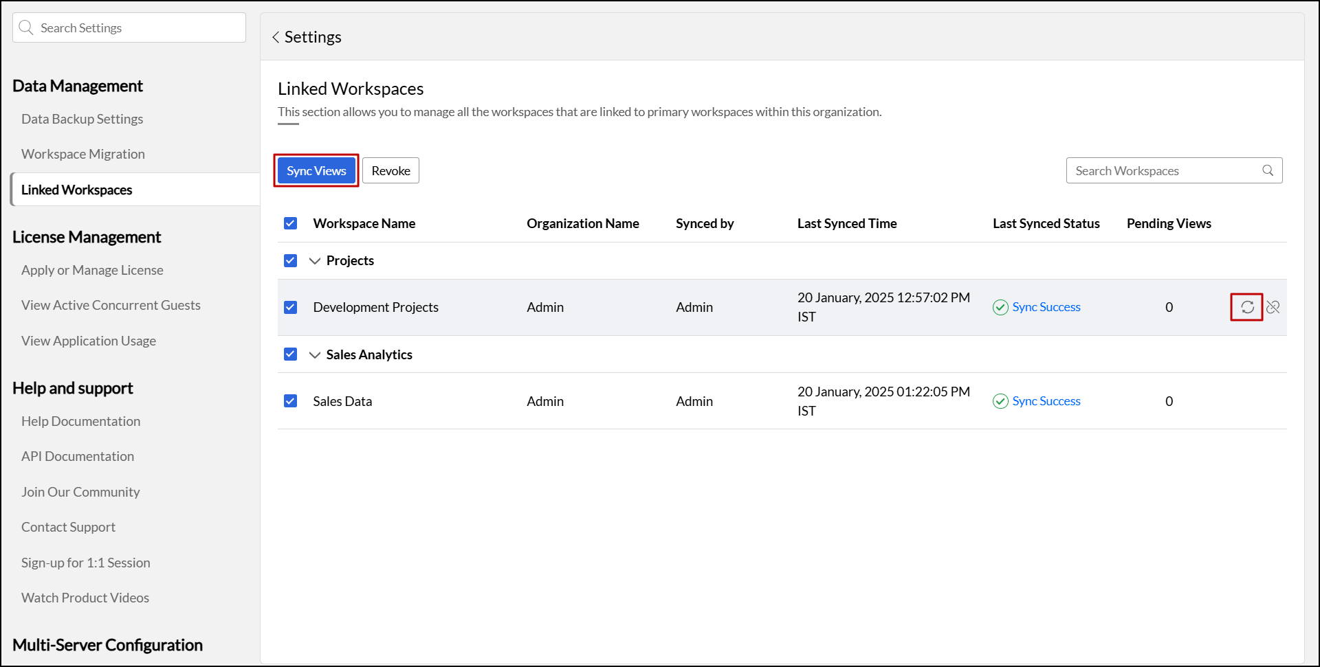 - Alternatively, use the Sync Views icon and Revoke icon next to each workspace's details to sync views or revoke the link for a specific secondary workspace.
