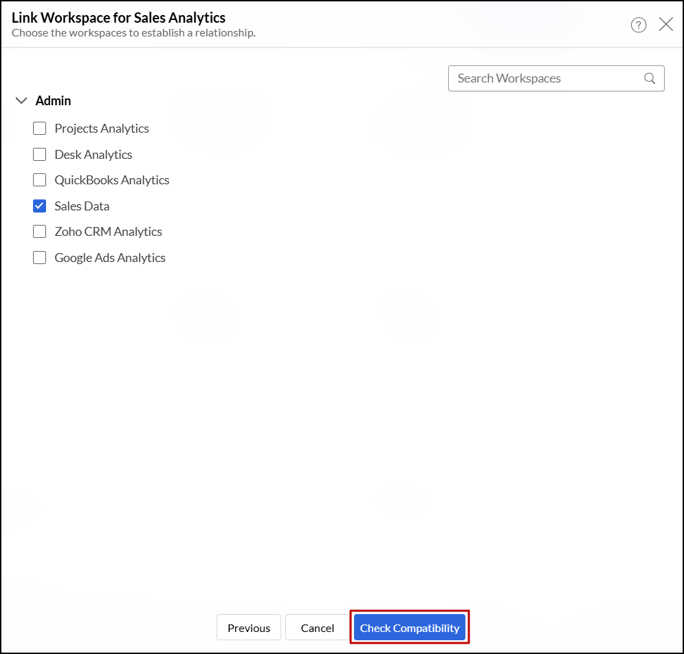 In the page that appears, select the desired workspaces and click Check Compatibility. This verifies whether the workspaces can be linked based on the data sources, views, and configurations in the primary workspace. Click here to learn more about compatibility.