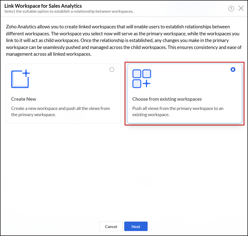 - Choose from existing workspaces: This option enables you to select one or more existing workspaces to act as secondary workspaces. Click here to learn more.